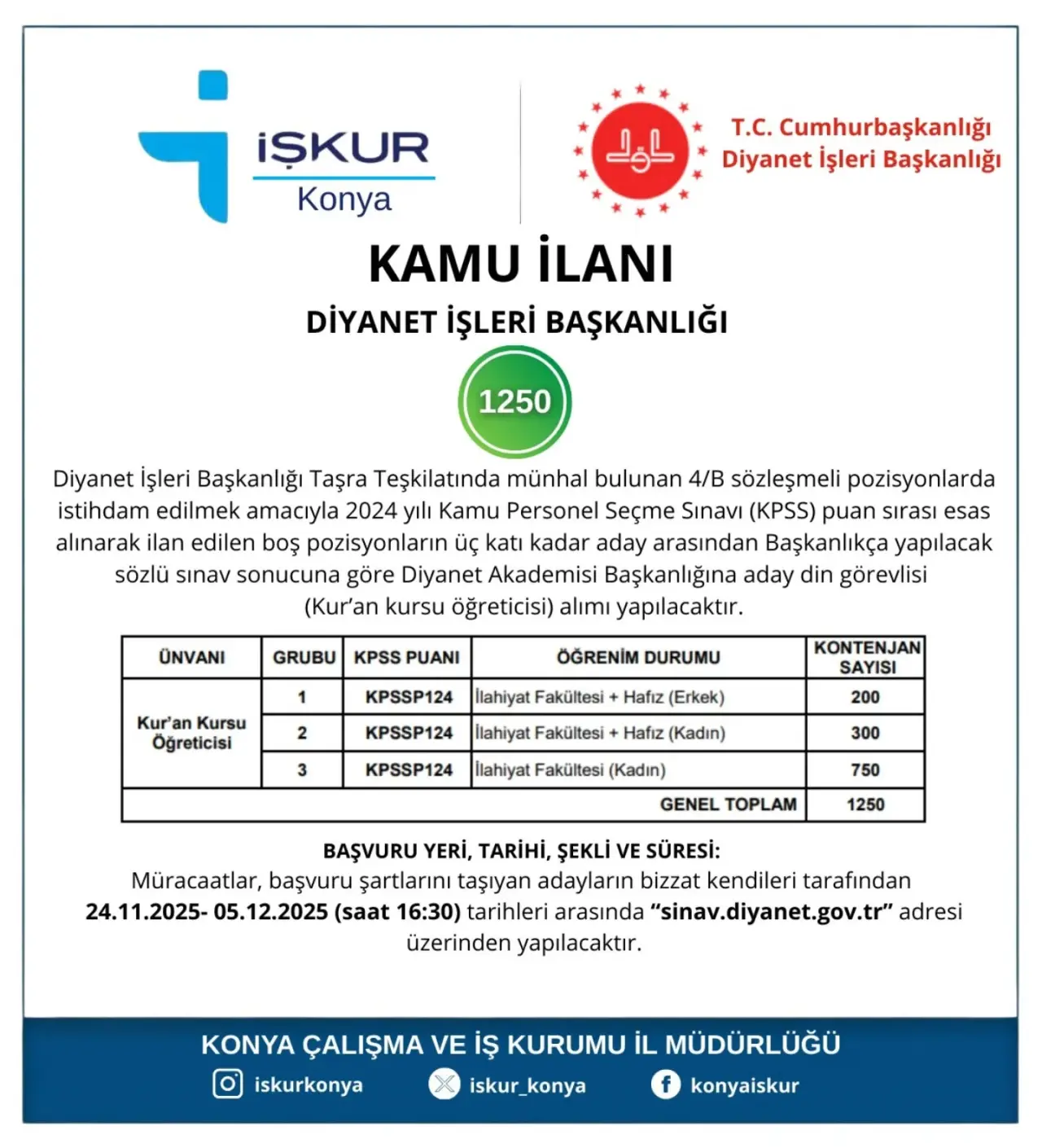 T.C. Diyanet İşleri Başkanlığı tarafından, Kur’an Kursu Öğreticisi kadrosunda görevlendirilmek üzere kamu iş ilanı yayımlandı.