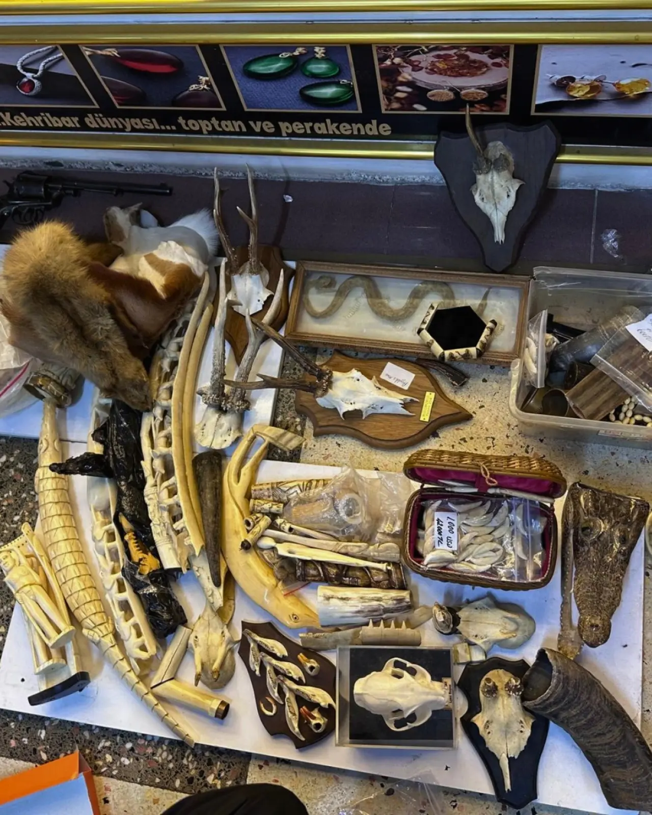 Adreste yapılan denetimde, başta fil dişi ve Caretta caretta kabuğu olmak üzere çok sayıda koruma altındaki türlere ait yasadışı ürün ele geçirildi.
