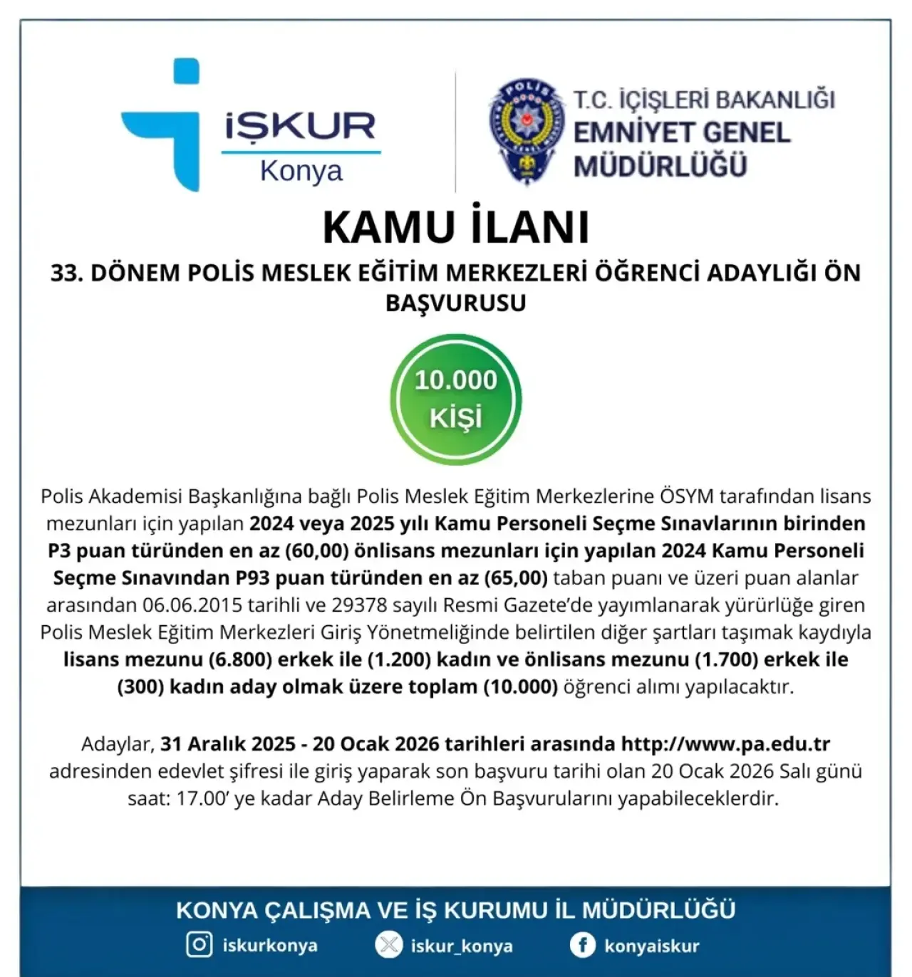 Konya İŞKUR, Polis Akademisi Başkanlığı bünyesinde açılan POMEM 33. Dönem öğrenci adaylığı ön başvuru sürecinin başladığını duyurdu. Polis olmak isteyen adaylar için başvurular 31 Aralık 2025 – 20 Ocak 2026 tarihleri arasında alınacak.