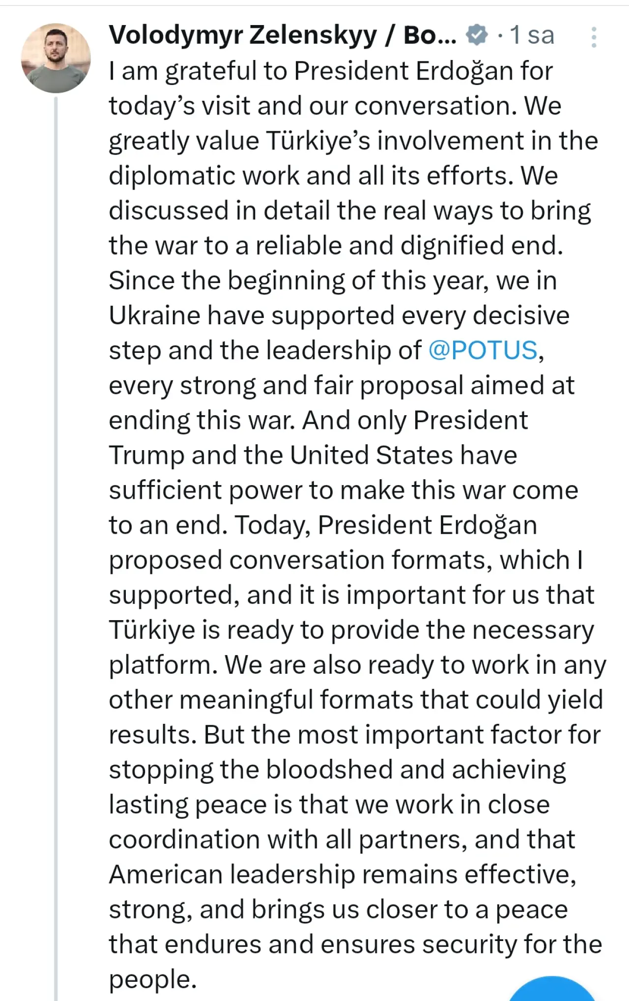 Başkan Erdoğan’ın önerdiği görüşme formatlarını desteklediklerini belirten Zelenskiy, Türkiye’nin bu süreçte gerekli platformu sağlamaya hazır olmasının önemine dikkat çekti. Zelenskiy ayrıca, kan dökülmesini durdurmak ve kalıcı barışı sağlamak için tüm ortaklarla yakın koordinasyon içinde çalışmanın ve Amerikan liderliğinin etkili olmasının kritik olduğunu vurguladı.