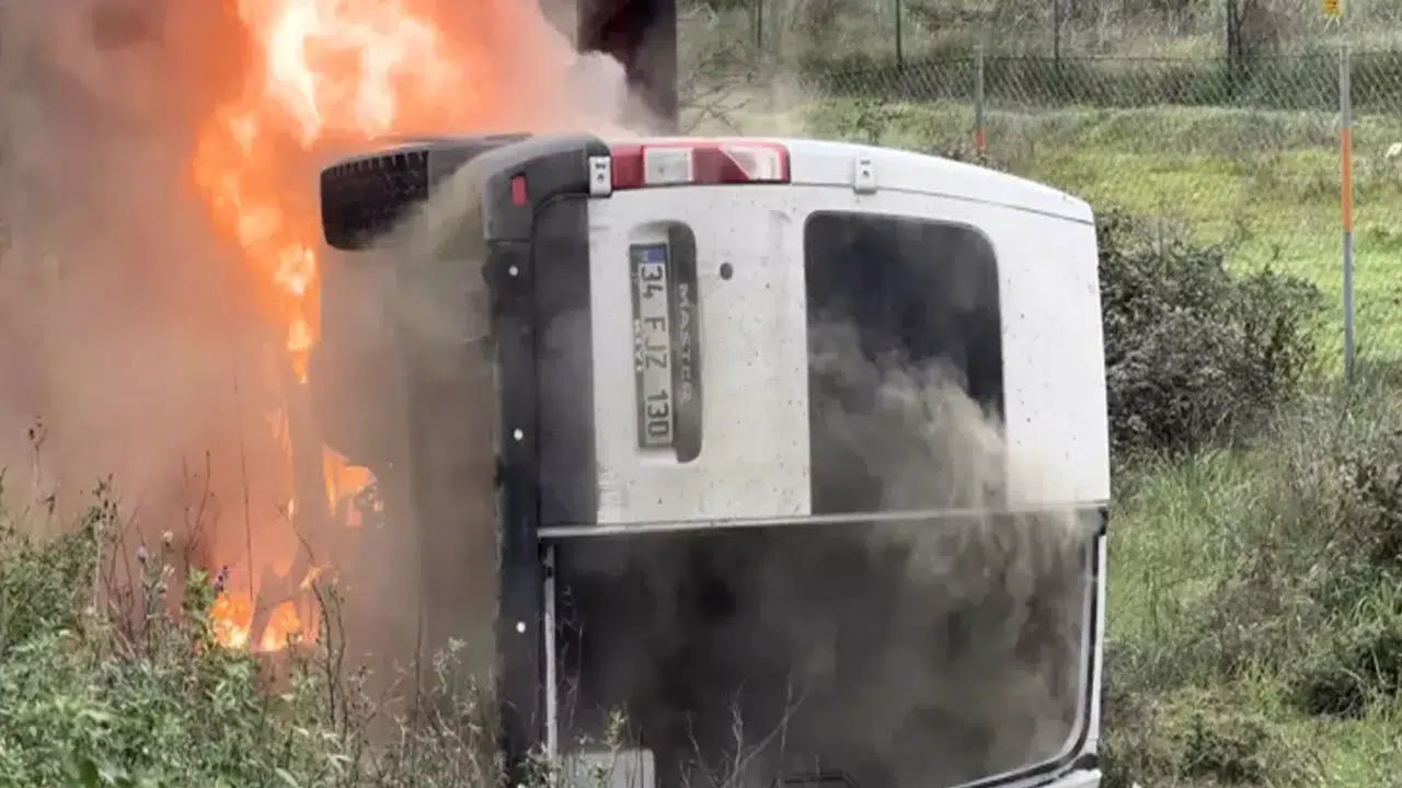 Tuzla Kuzey Marmara Otoyolu'nda sağanak nedeniyle kayganlaşan yolda şoförünün direksiyon hakimiyetini kaybettiği minibüs yol kenarındaki boş araziye uçarak devrildi. Kazanın ardından alev alev yanmaya başlayan minibüste çıkan yangın itfaiye ekipleri tarafından söndürüldü.