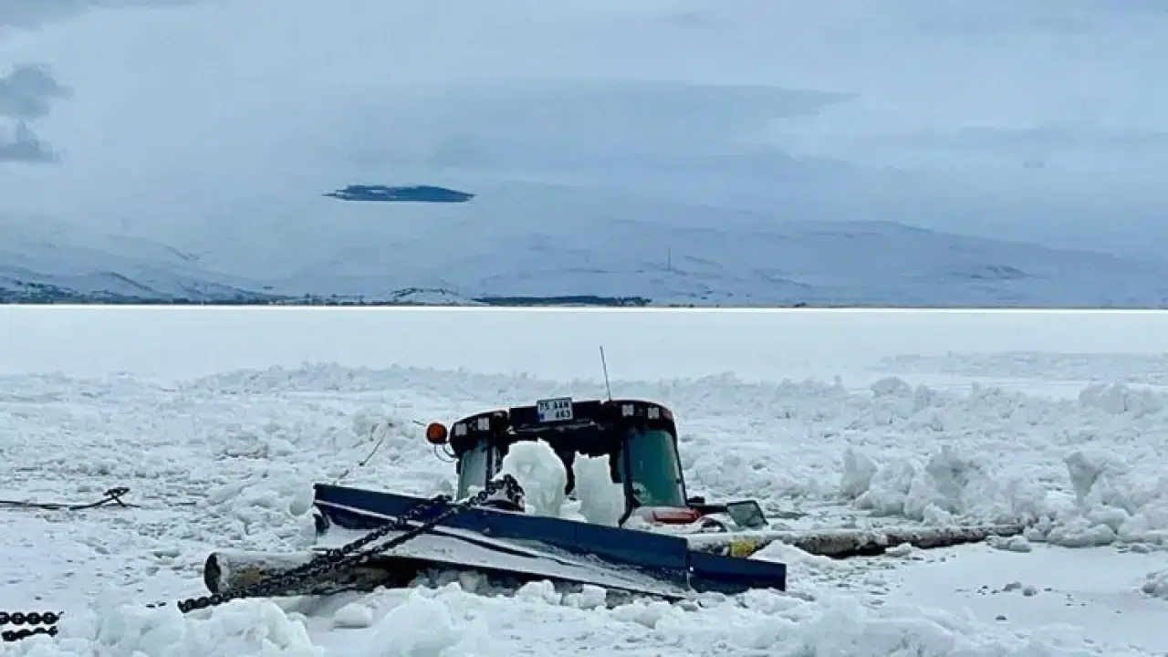 Ardahan ile Kars sınırlarında bulunan ve kış mevsiminde yüzeyi tamamen donan Çıldır Gölü üzerinde, 14 Şubat'ta gerçekleştirilmesi planlanan 10. Altın At Kristal Buz Festivali hazırlıkları için dün çalışma yapan bir traktör battı.