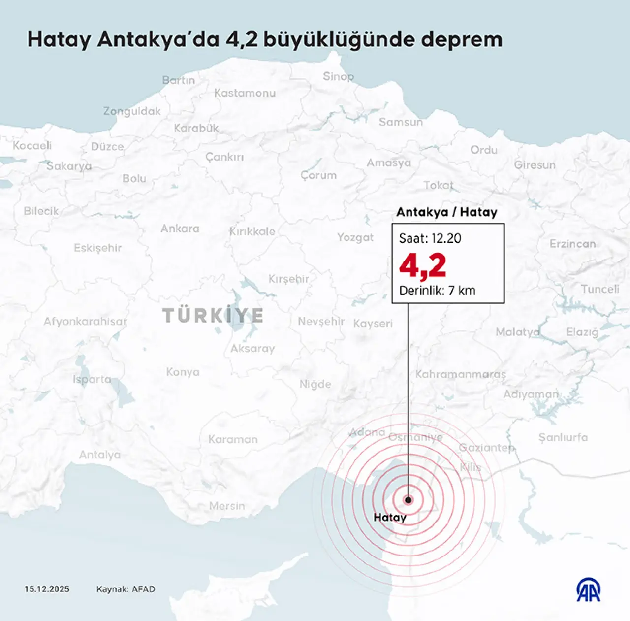 Afet ve Acil Durum Yönetimi Başkanlığının internet sitesinde yer alan bilgiye göre, merkez üssü Antakya ilçesi olan 4,2 büyüklüğünde sarsıntı kaydedildi.