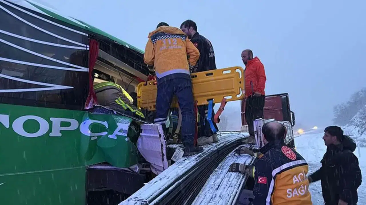 Kaza, Tokat– Sivas kara yolunun Kızıl İniş mevkisinde meydana geldi. Sivas istikametine seyir halinde olan Topcan firmasına ait 60 BD 891 plakalı yolcu otobüsü, karla kaplı yolda aynı yönde ilerleyen İsa Şahin idaresindeki 55 BLC 53 plakalı TIR’a arkadan çarptı.