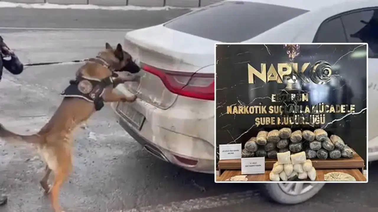 Erzurum Cumhuriyet Başsavcılığı’nın koordinesinde Emniyet Müdürlüğü Narkotik Suçlarla Mücadele Şube Müdürlüğü ekipleri, durdurdukları bir otomobilde arama yaptı. Narkotik madde arama köpeği Hera’nın da katıldığı aramada otomobilin bagaj bölümünde 23 kilo 250 gram skunk, 11 kilogram metamfetamin bulundu. Aramada ayrıca 1 ruhsatsız tabanca, 15 fişek, 3 bin 915 TL ile 5 bin ABD doları ele geçirildi. Uyuşturucuyla ilgili gözaltına alınan A.K. (44) ve S.K. (41) isimli şüpheliler çıkarıldıkları adliyede tutuklandı.