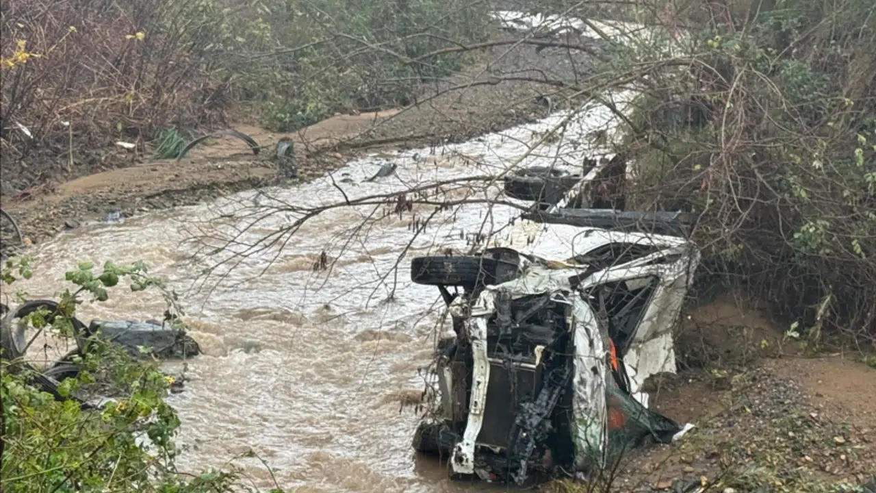 Çökmenin ardından yoldaki pikap ile kamyonet dereye düştü.