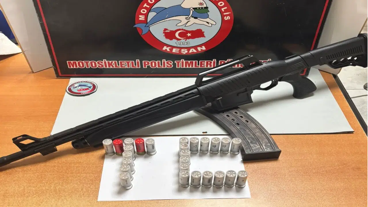 Keşan İlçe Emniyet Müdürlüğü Motosikletli Polis Timleri Büro Amirliği ekipleri, Mustafa Kemal Paşa Mahallesi Zati Yörüker Caddesi üzerinde sırtında halıyla yürüyen A.A.’nın durumundan şüphelendi. Polis, durdurduğu A.A.’nın taşıdığı halının içerisinde ruhsatsız av tüfeği ve şarjör içerisinde 25 fişek ele geçirdi. Gözaltına alınan A.A. hakkında adli işlem başlatıldı