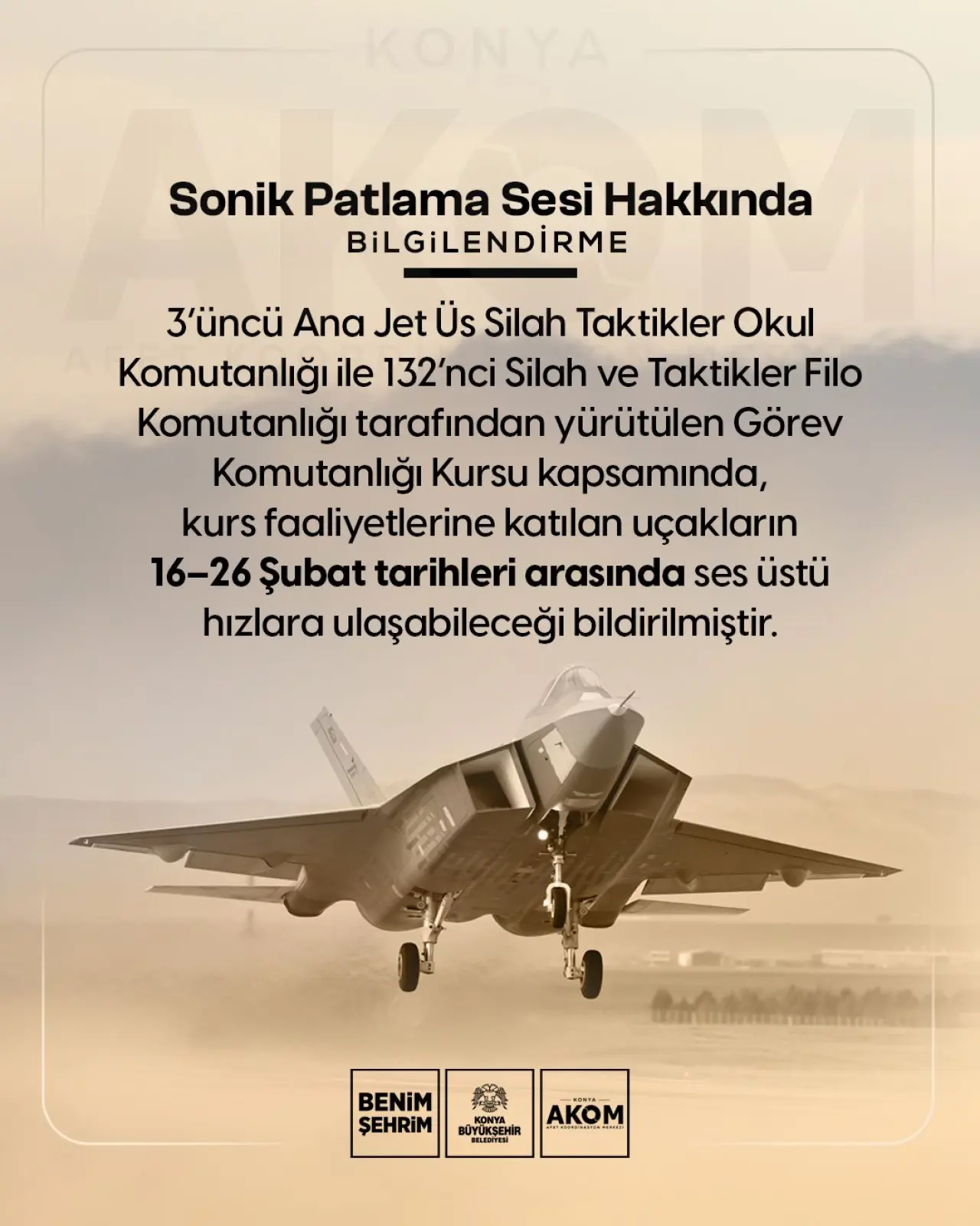 Yapılan açıklamada, kurs faaliyetlerine katılan uçakların 16–26 Şubat tarihleri arasında ses üstü hızlara ulaşabileceği bildirildi. Bu uçuşlar sırasında patlama benzeri yüksek seslerin, yani sonik patlamaların duyulabileceği ifade edildi.