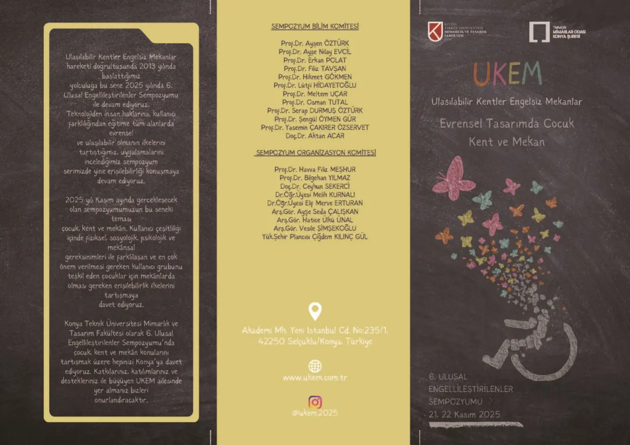 Konya Teknik Üniversitesi Mimarlık ve Tasarım Fakültesi, erişilebilirliğin geleceğine yön verecek bu önemli buluşmaya katkı sunmak, tartışmalara dahil olmak ve UKEM ailesinin büyüyen yapısının bir parçası olmak isteyen tüm akademisyenleri, uzmanları, kamu ve sivil toplum temsilcilerini Konya’ya davet ediyor.