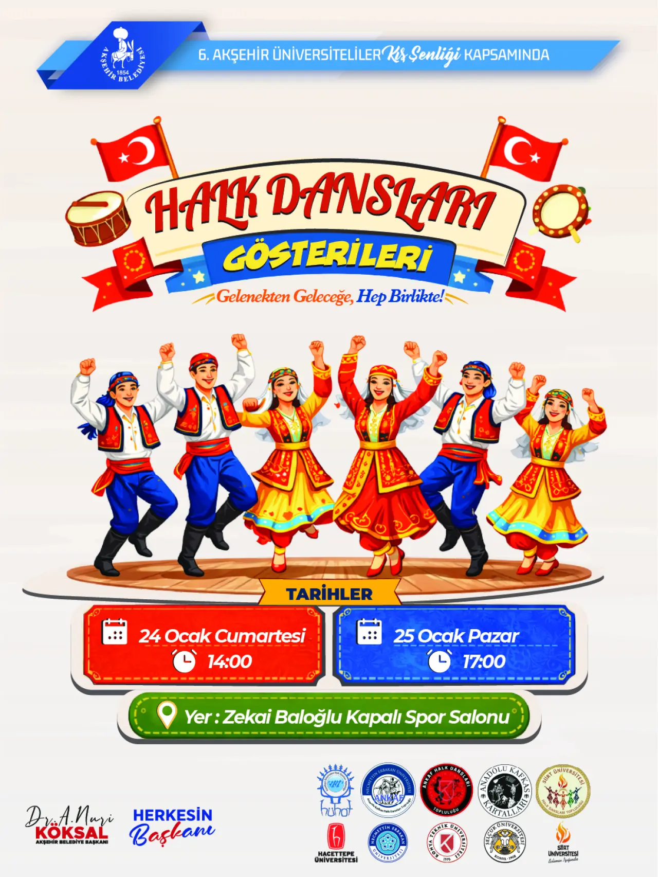 Açılışın ardından, Türkiye’nin farklı üniversitelerinden gelen halk dansları toplulukları sahne alacak. Selçuk Üniversitesi, Necmettin Erbakan Üniversitesi, Konya Teknik Üniversitesi, Hacettepe Üniversitesi, Siirt Üniversitesi ve Anadolu Kafkas Dans Akademisi tarafından sunulacak gösterilerle katılımcılara renkli anlar yaşatacak.