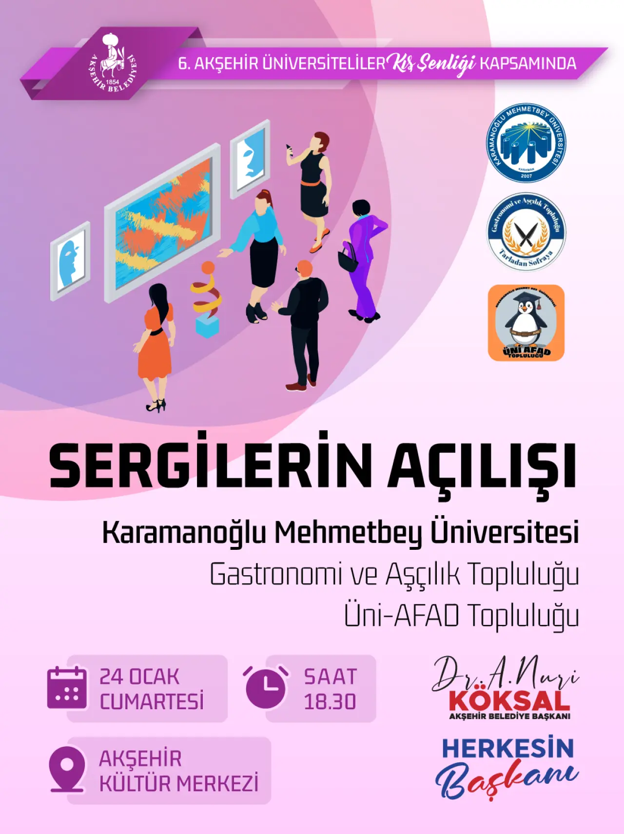 Şenliğin akşam programı ise Akşehir Kültür Merkezi’nde devam edecek. Saat 18.30’da sergi açılışlarıyla başlayacak olan program, saat 19.00’da Prof. Dr. Yusuf Halaçoğlu, “Kuruluşundan Günümüze Türkiye” başlıklı söyleşisiyle devam edecek.