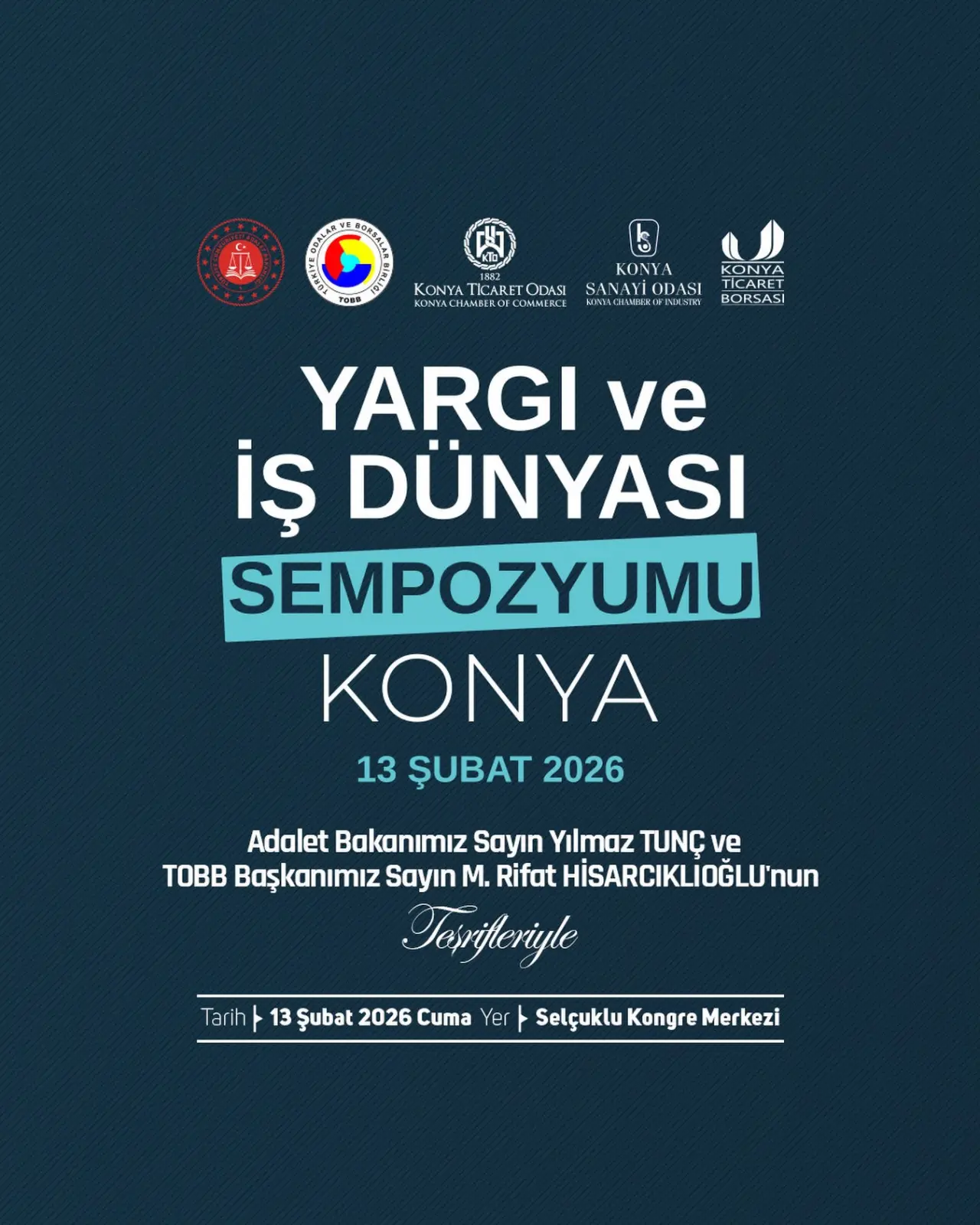 Adalet Bakanımız Sayın Yılmaz Tunç ile TOBB Başkanımız Sayın M. Rifat Hisarcıklıoğlu’nun teşrifleriyle Yargı ve İş Dünyası Sempozyumu, 13 Şubat 2026 Cuma günü Konya’da düzenlenecek.