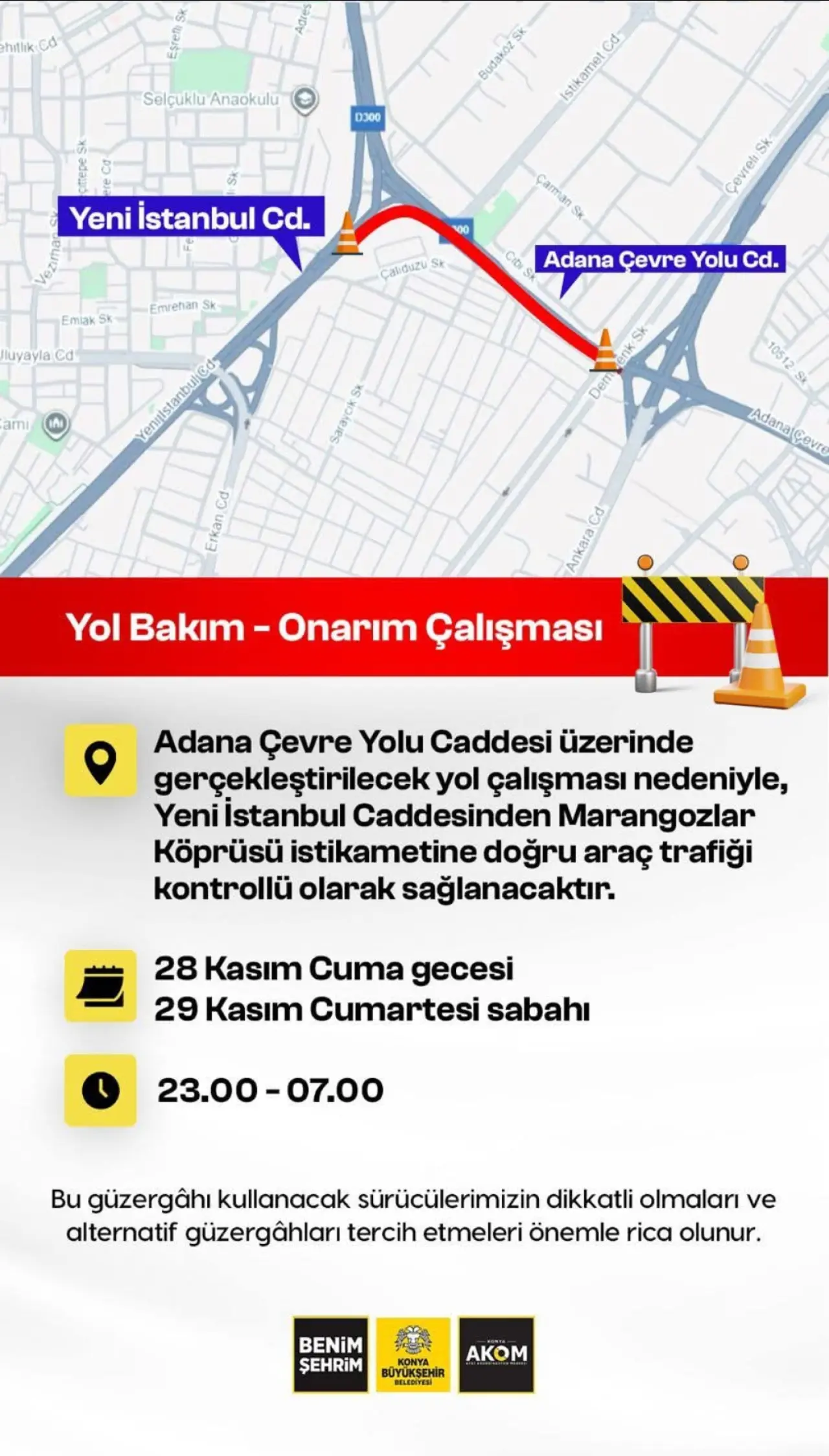 Konya Büyükşehir Belediyesi AKOM, Adana Çevre Yolu Caddesi üzerinde gerçekleştirilecek yol bakım ve onarım çalışması nedeniyle sürücülere önemli bir duyuruda bulundu.