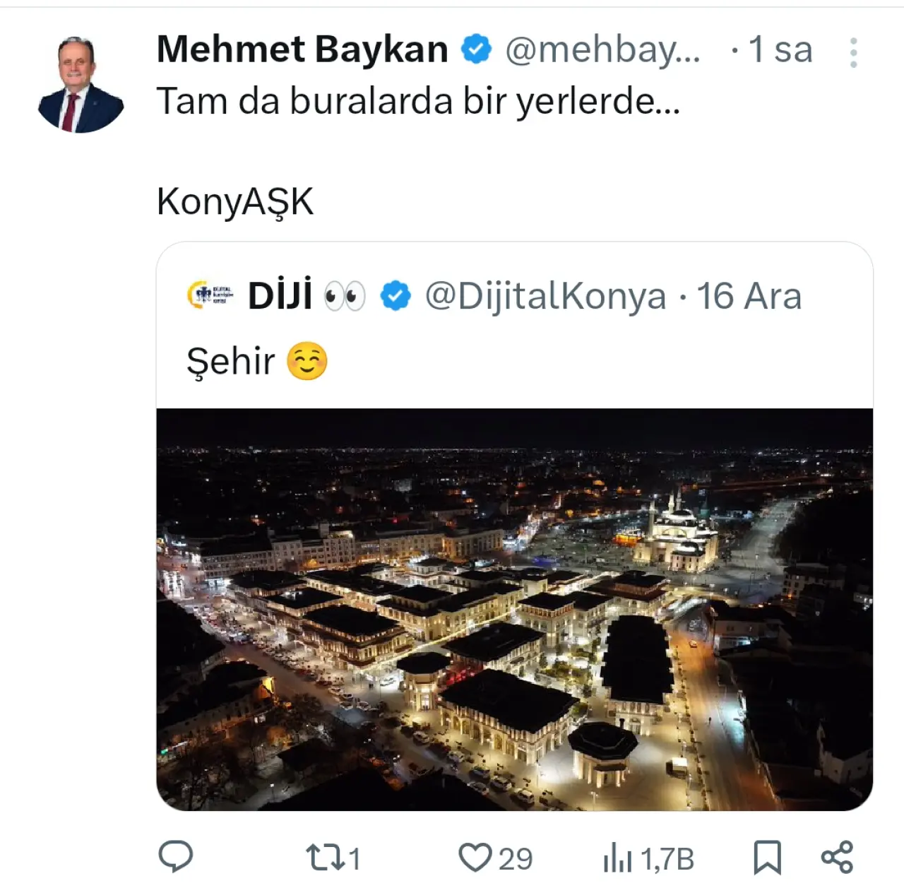 “Tam da buralarda bir yerlerde KonyAşk” notuyla sosyal medyadan paylaşım yapan AK Parti Konya Milletvekili Mehmet Baykan'ın paylaşımı yüzleri gülümsetti.
