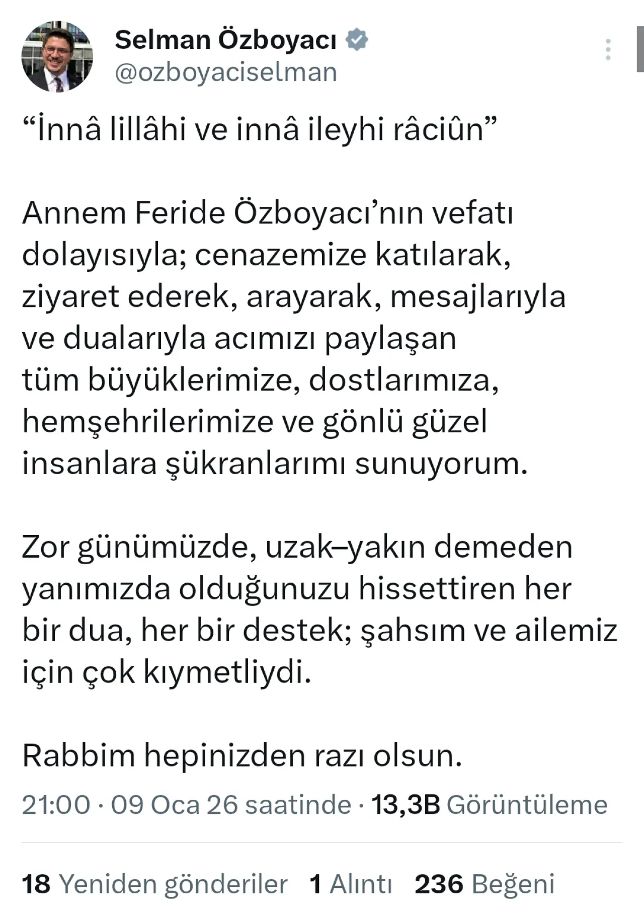 Paylaşımında; cenazeye katılarak, taziyede bulunarak, telefonla arayarak, mesajlarıyla ve dualarıyla acılarını paylaşan tüm büyüklere, dostlara ve hemşehrilere teşekkür eden Özboyacı, gösterilen destek ve samimiyetin kendisi ve ailesi için büyük anlam taşıdığını ifade etti.