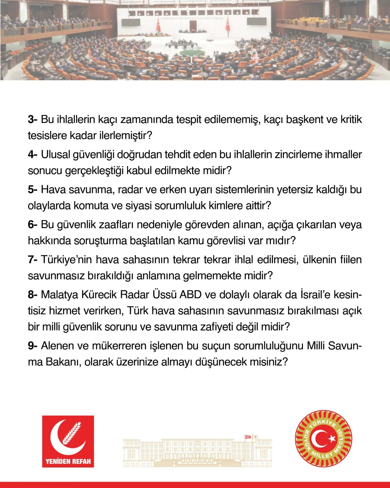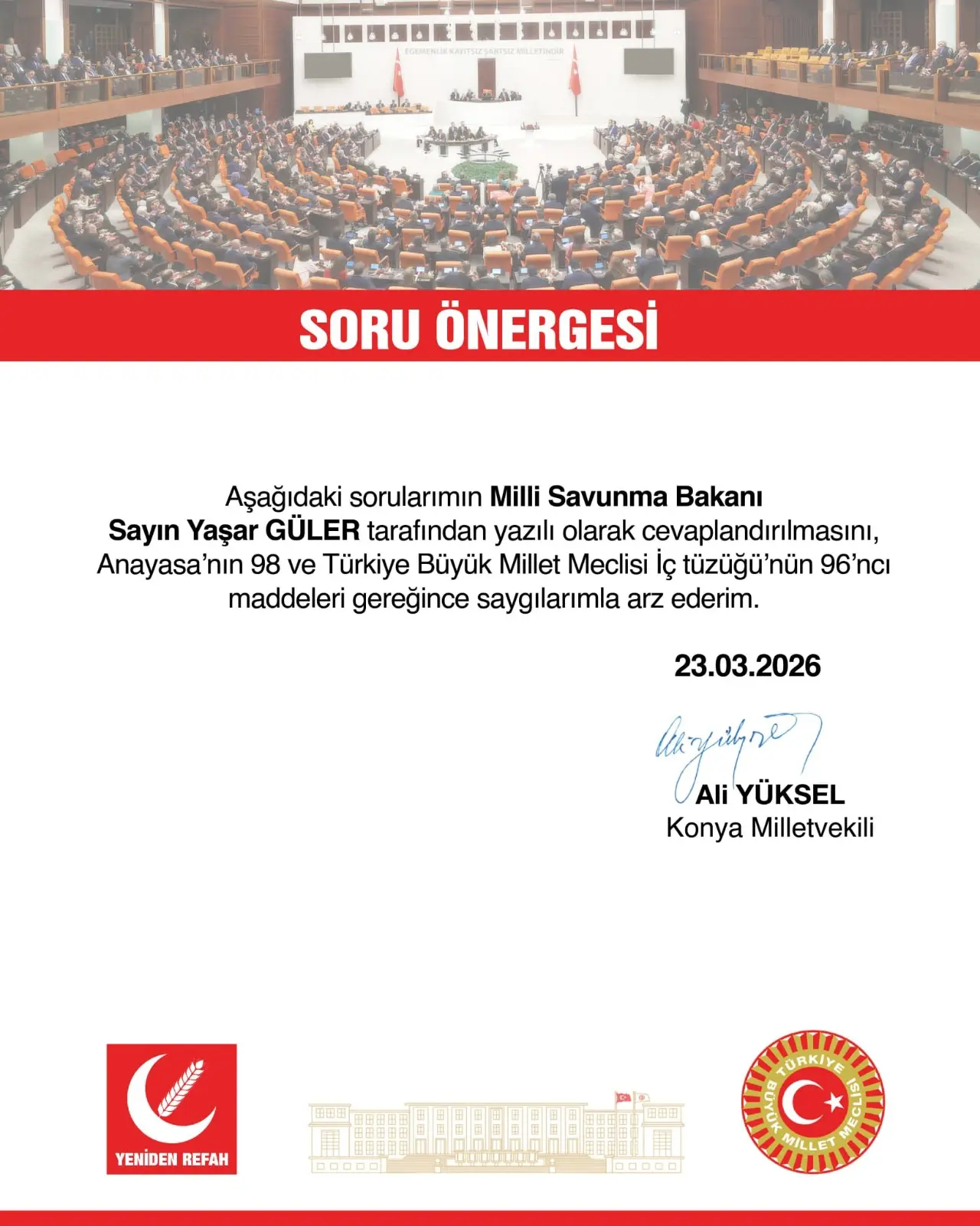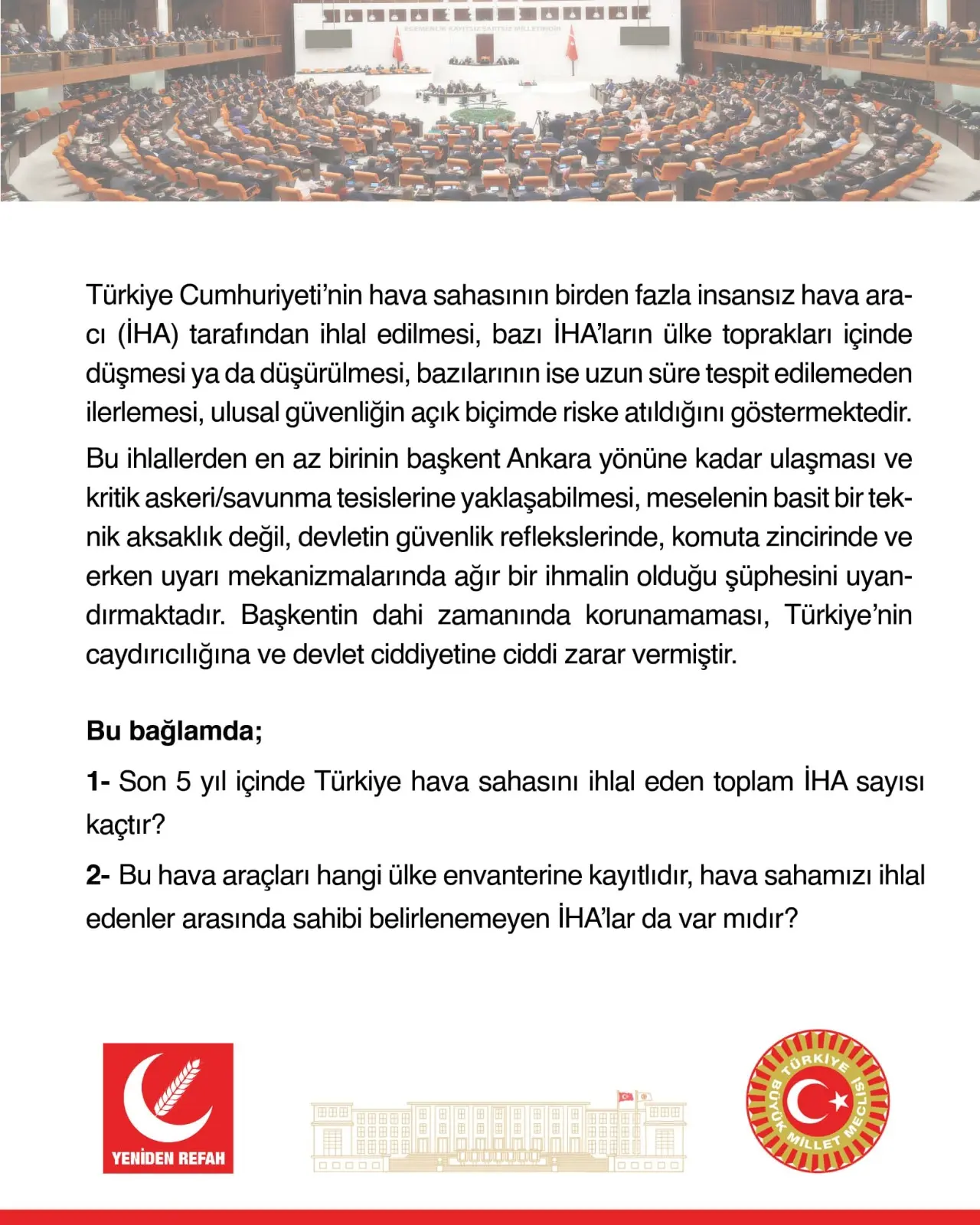 Yeniden Refah Partisi Konya Milletvekili Ali Yüksel, İHA ihlalleri ve tespit edilemeyen hava araçlarıyla ilgili soru önergesinin Milli Savunma Bakanı tarafından yazılı olarak yanıtlanmasını talep ettiklerini belirtti. Ali Yüksel, meseleye ilişkin tüm yönlerin açıklığa kavuşmasının hem kamuoyunun doğru bilgilendirilmesi hem de benzer güvenlik risklerinin önlenmesi açısından önemli olduğunu ifade etti.