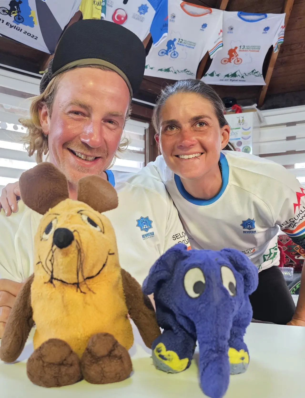 Yanlarında maskotlarıyla birlikte seyahat eden çift, dünya turu boyunca barış ve dayanışma mesajı verirken, ilçede misafirperverlik örneğiyle karşılandı.