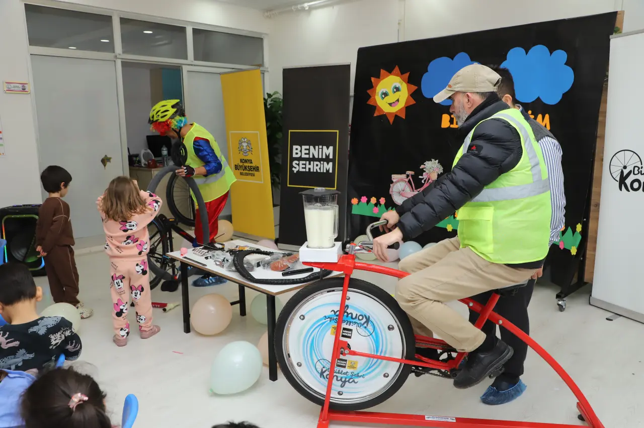 İl Milli Eğitim Müdürlüğü iş birliğiyle anaokullarında hayata geçirilen program kapsamında öğrenciler; bisiklet kullanmanın faydaları hakkında bilgilendiriliyor, bisiklet parçalarını tanıyor, Bisiklet Şehri Konya boyama kitabı etkinliklerine katılıyor. Blender bisikletlerle içecek hazırlayan, bisiklet temalı müzikler eşliğinde keyifli vakit geçiren çocuklara, reflektörlü yelek, kask ve koruyucu ekipmanların önemi de uygulamalı olarak anlatılıyor.