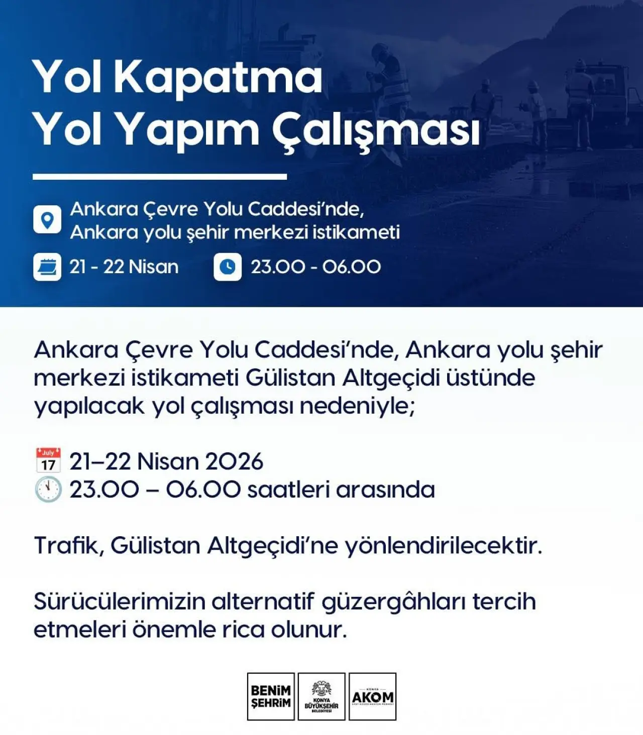 Konya AKOM, şehir trafiğini ilgilendiren önemli bir duyuru yaptı. Ankara Çevre Yolu Caddesi’nde gerçekleştirilecek yol yapım çalışmaları nedeniyle belirli saatlerde trafik akışında değişiklik yaşanacak.