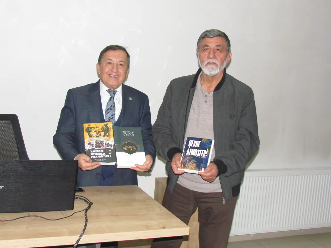 Programdan sonra Aydınlar Ocağı Başkanı Dr. Mustafa Güçlü Namık Ceyhan’a günün anısı olarak kitap takdim ederken, Ceyhan’da kaleme aldığı Çevre Atmosferi adlı kitabı hediye etti.