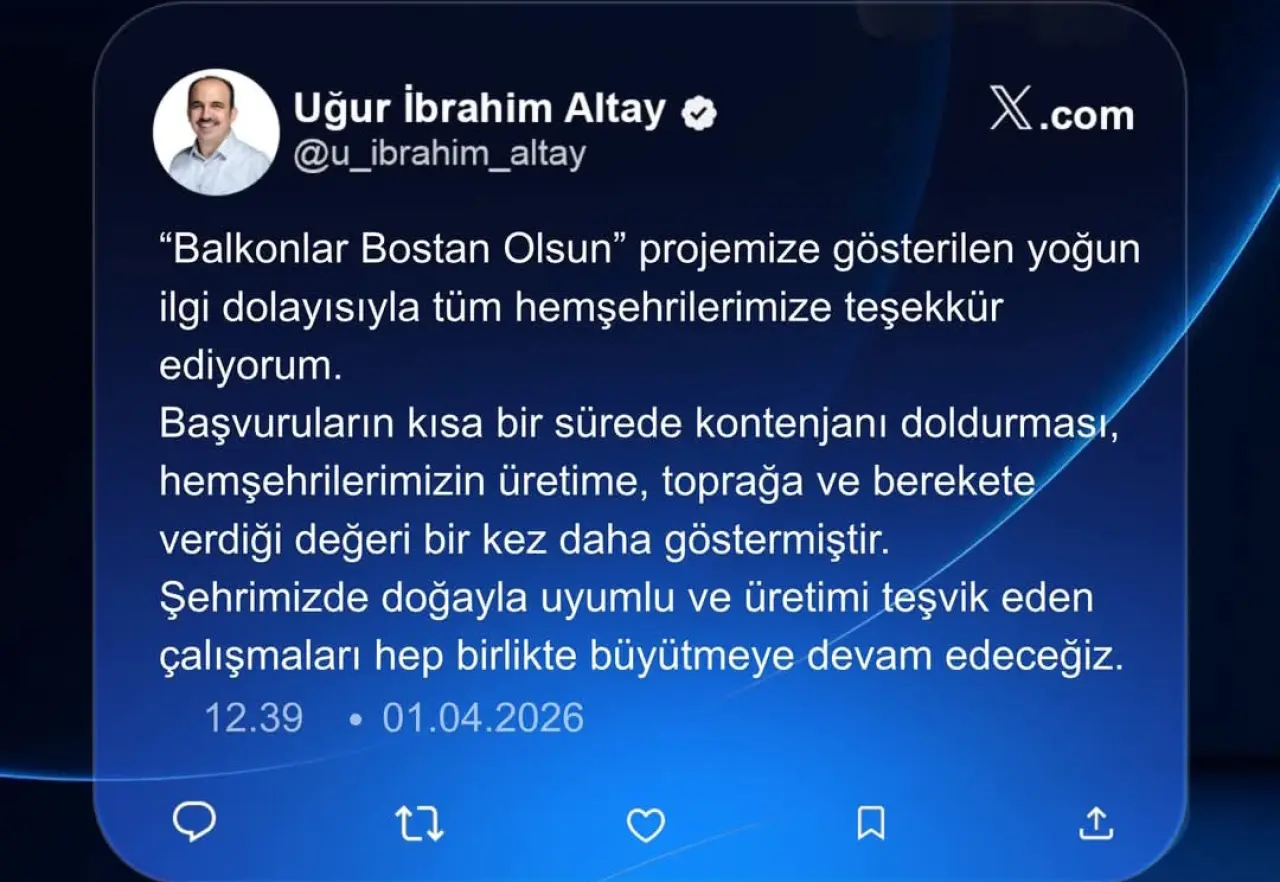 Konya Büyükşehir Belediye BaşkanıUğur İbrahim Altay, “Balkonlar Bostan Olsun” projesine gösterilen yoğun ilgiden dolayı vatandaşlara teşekkür etti. Kısa sürede kontenjanın dolduğunu belirten Altay, bu ilginin Konyalıların üretime, toprağa ve berekete verdiği önemi bir kez daha ortaya koyduğunu ifade etti.