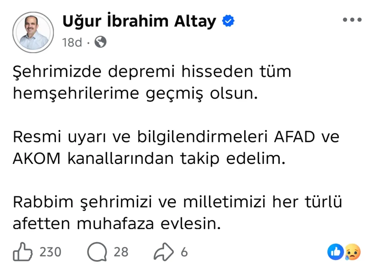 “Şehrimizde depremi hisseden tüm hemşehrilerime geçmiş olsun. Resmi uyarı ve bilgilendirmeleri AFAD ve AKOM kanallarından takip edelim. Rabbim şehrimizi ve milletimizi her türlü afetten muhafaza eylesin.”