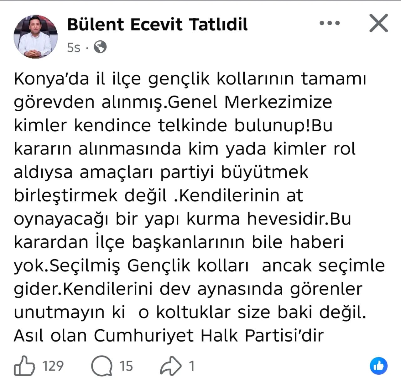 Cumhuriyet Halk Partisi (CHP) Konya teşkilatında gençlik kollarına yönelik alınan kararlar tartışma yarattı. Parti içinde tüm ilçe gençlik kolları yönetimlerinin görevden alınması, kamuoyunda ve teşkilat içinde geniş yankı buldu.