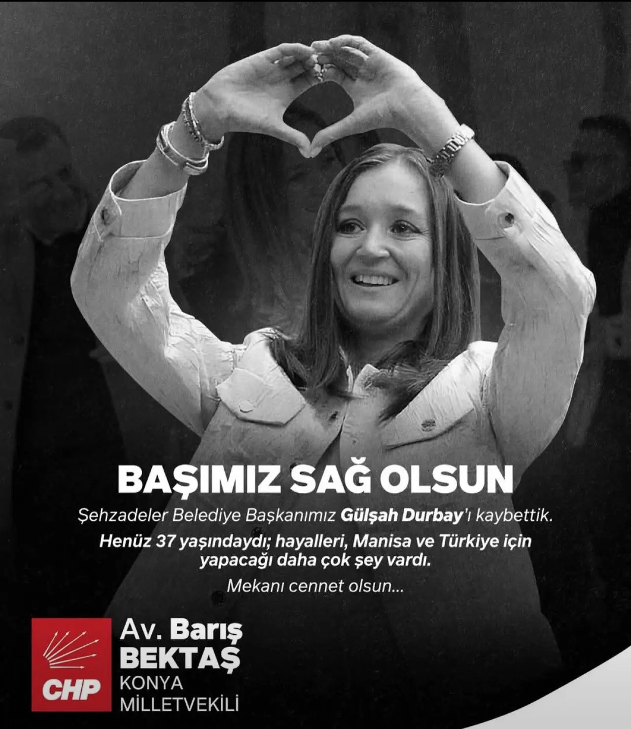 Cumhuriyet Halk Partisi (CHP) Konya Milletvekili Barış Bektaş, Şehzadeler Belediye Başkanı Gülşah Durbay’ın vefatı dolayısıyla bir taziye mesajı yayımladı. Bektaş, genç yaşta gelen bu acı kaybın Manisa’da ve siyaset camiasında derin bir üzüntü yarattığını ifade etti.