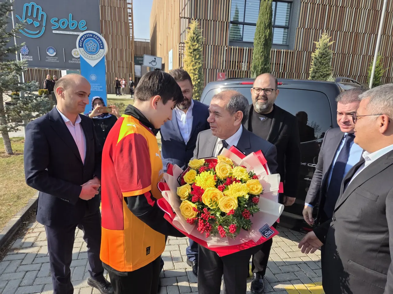 Galatasaray Spor Kulübü Başkanı Dursun Aydın Özbek ve beraberindeki Tümosan Konyaspor Kulübü Başkanı Ömer Atiker, SOBE Vakfı Başkan Yardımcısı Targut Polat ve Yönetim Kurulu Üyeleri Süleyman Oğuz ve Mehmet Akcan ile Konyaspor Kulübü Başkan Vekili Lütfi Can Başaran tarafından karşılandı. Başkan Özbek ve Başkan Atiker’e, otizmli öğrenciler Ahmet Üçer ve Yahya Arıcı tarafından takımlarının renklerinde çiçek takdim edildi.