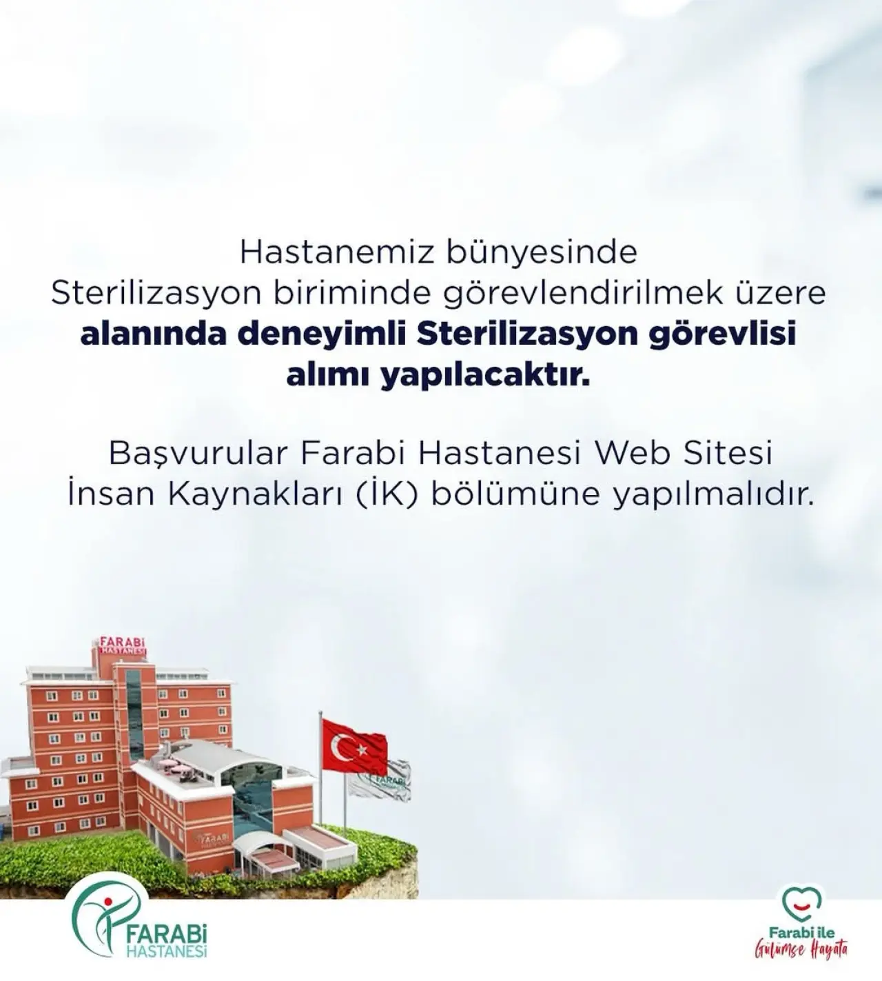 Konya’nın köklü sağlık kuruluşlarından Farabi Hastanesi, bünyesinde görevlendirilmek üzere deneyimli Sterilizasyon Görevlisi alımı yapacağını duyurdu.