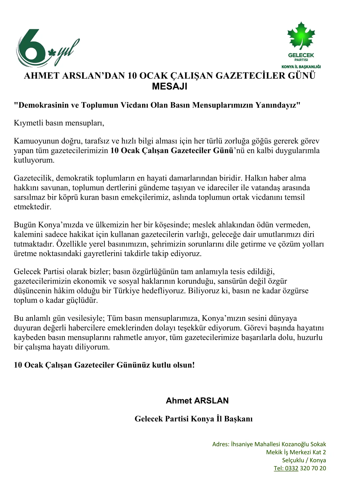 Gelecek Partisi Konya İl Başkanı Ahmet Arslan, kamuoyunun doğru ve tarafsız bilgi alması için her türlü zorluğa göğüs geren gazetecilerin anlamlı gününü kutladı. Yazılı bir açıklama yayımlayan Arslan, gazetecilik mesleğinin toplumsal dertleri gündeme taşıma ve vatandaşla idareciler arasında sarsılmaz bir köprü kurma görevini üstlendiğini belirtti.