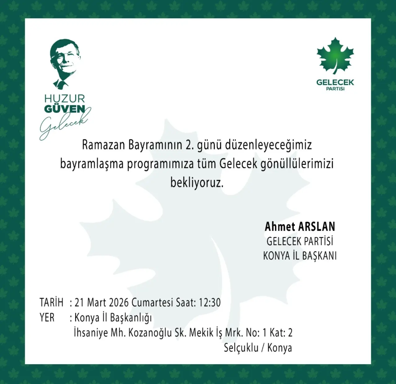 Gelecek Partisi Konya İl Başkanlığı, Ramazan Bayramı dolayısıyla düzenleyeceği bayramlaşma programına tüm vatandaşları davet etti.