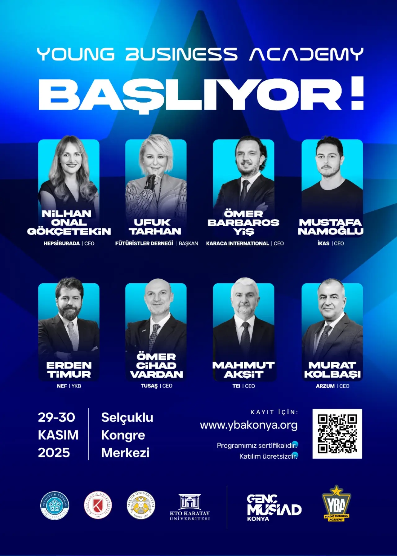 Genç MÜSİAD Konya, her iki senede bir düzenlediği, üniversite öğrencilerinin ve genç iş insanlarının etki odaklı yetkinliklerinin gelişmesine, toplumda fark oluşturan bireyler olmalarına katkı sağlamayı hedefleyen ve alanında seçkin İş İnsanları, CEO’lar ve Akademisyenlerin konuşmacı olarak katılacağı Young Business Academy 29-30 Kasım’da Selçuklu Kongre Merkezi’nde gerçekleştirilecek.