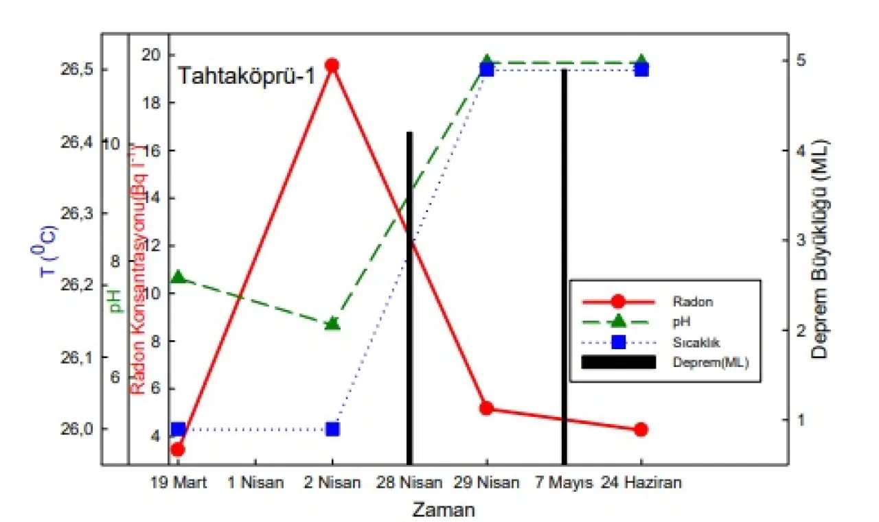 Hatay'daki artçı depremler öncesinde radon seviyelerinin yükseldiğini belirlediklerini ifade eden Prof. Dr. Erdoğan, "Deprem öncesinde radon seviyeleri artıyor. İç basınç ve sıkışma, kırıklarla açığa çıkan radon fay hatlarını izleyerek çatlaklardan atmosfere, toprak gazına ya da yer altı sularına karışıyor. Deprem öncesi yükseliş, depremden sonra da hızlı bir düşüş şeklinde kendini gösteriyor. Hatay'daki o iki kaynak suyunda ölçümler yaptık. Bunlardan biri Tahtaköprü termal suyu. Diğeri ise Hamamat Kaplıcası diye geçiyor. Kaplıca yıkılmıştı ve örneklerimizi suyun kaynağından aldık. Bu iki kaynakta da nisan sonu mayıs aylarında olan 4.9 ve 4.3 artçı depremler öncesinde bir yükseliş, sonrasında bir düşüş şeklinde anomali gözledik" dedi.