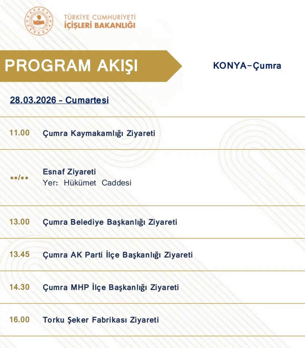 İçişleri Bakanı Mustafa Çiftçi, Konya’nın Çumra ilçesinde gerçekleştireceği ziyaret programıyla bir dizi temas ve incelemelerde bulunacak. 28 Mart Cumartesi günü düzenlenecek program kapsamında Bakan Çiftçi, kamu kurumları, siyasi teşkilatlar ve sanayi kuruluşlarını ziyaret edecek.