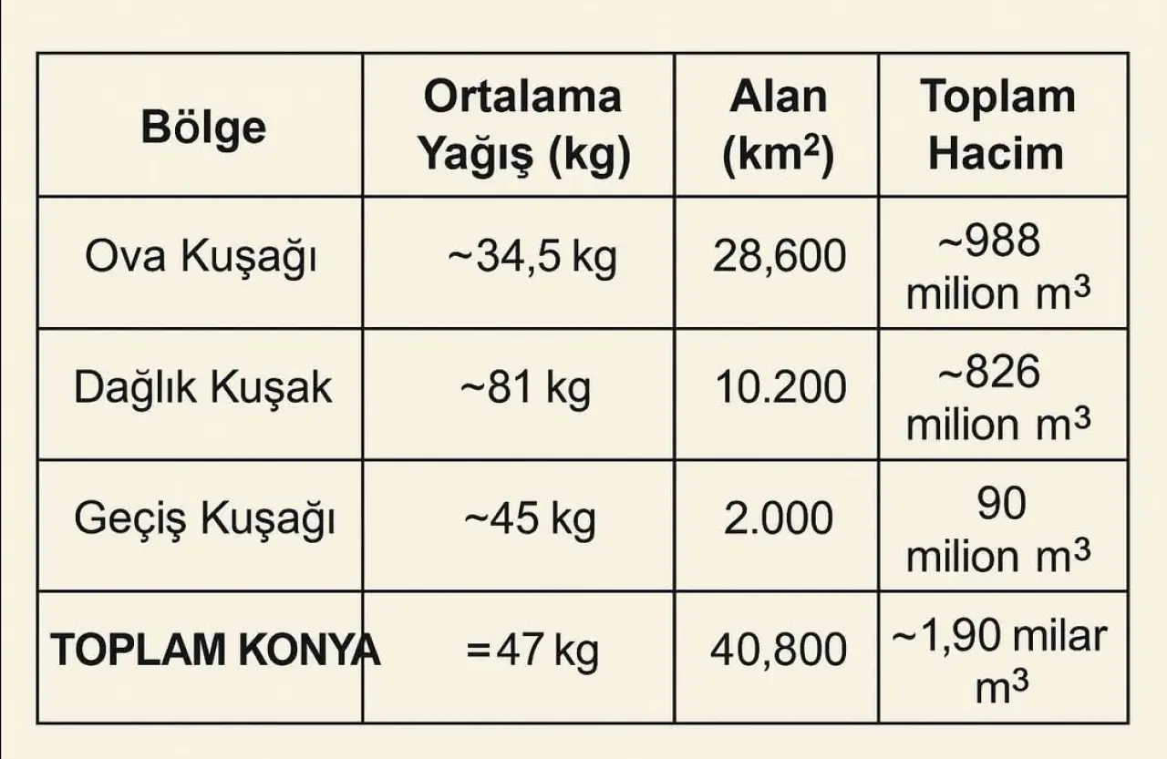 Paylaşımda yer alan yağış haritası ve hesaplamalara göre, iki haftalık süreçte Konya genelinde yaklaşık 1.9 milyar metreküp suyun toprağa ulaştığı ifade edildi.