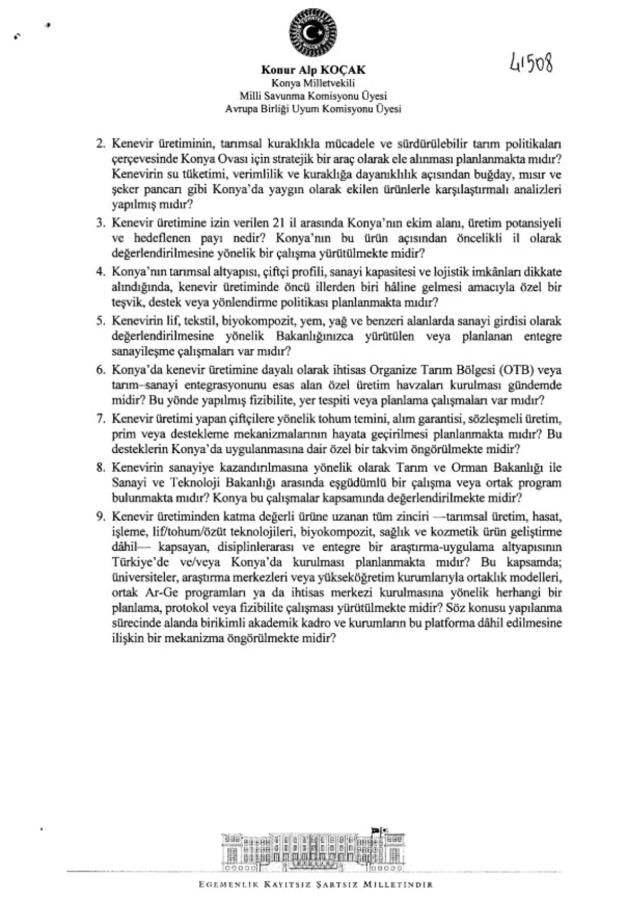 Koçak’ın soru önergesinde ayrıca Konya’da kenevire dayalı bir İhtisas Organize Tarım Bölgesi (OTB) kurulup kurulmayacağı da soruldu. Önergede, kenevir üretiminden işlenmesine kadar tüm süreci kapsayan tarım-sanayi entegrasyonunun geliştirilmesine yönelik planlar da gündeme getirildi. Önergede ayrıca şu konulara ilişkin bilgi talep edildi: