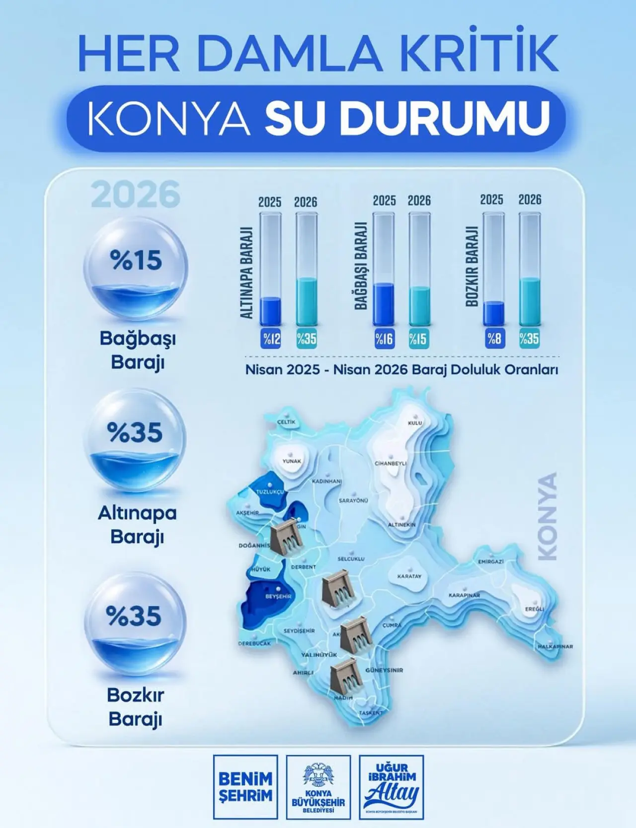 Konya Büyükşehir Belediyesi KOSKİ Genel Müdürlüğü, Nisan 2026’ya ait baraj doluluk oranlarını kamuoyuyla paylaşarak kuraklık riskine karşı önemli uyarılarda bulundu.