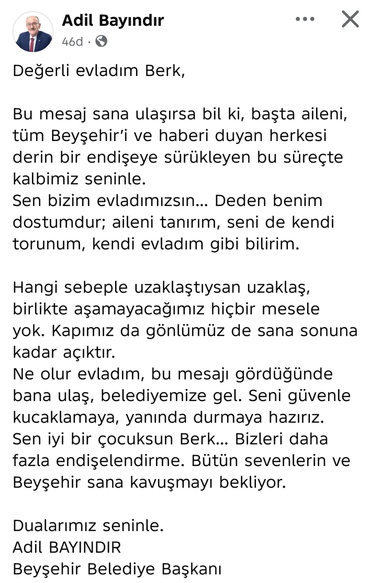 “Bu mesaj sana ulaşırsa bil ki; başta aileni, tüm Beyşehir’i ve haberi duyan herkesi derin bir endişeye sürükleyen bu süreçte kalbimiz seninle. Sen bizim evladımızsın. Deden benim dostumdur; aileni tanırım, seni de kendi torunum, kendi evladım gibi bilirim. Hangi sebeple uzaklaştıysan uzaklaş, birlikte aşamayacağımız hiçbir mesele yok.”