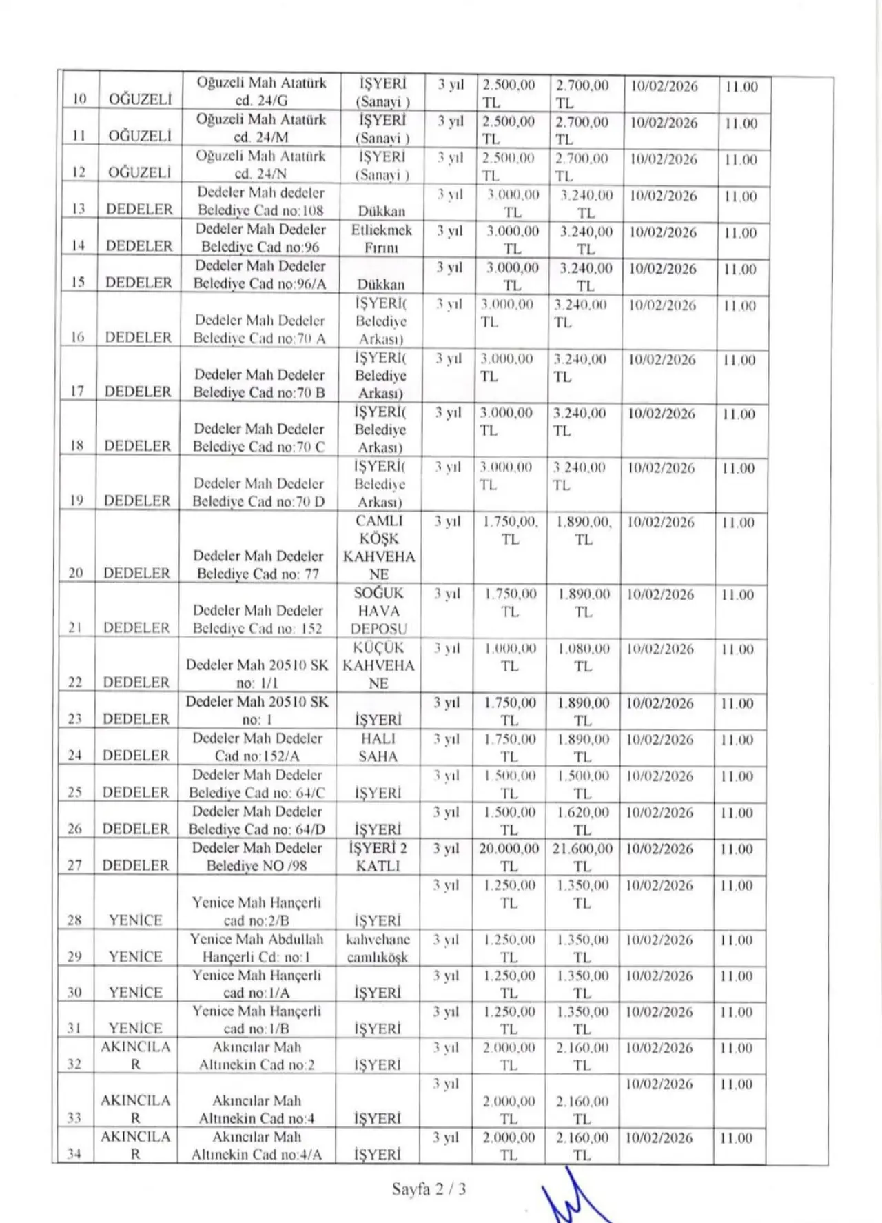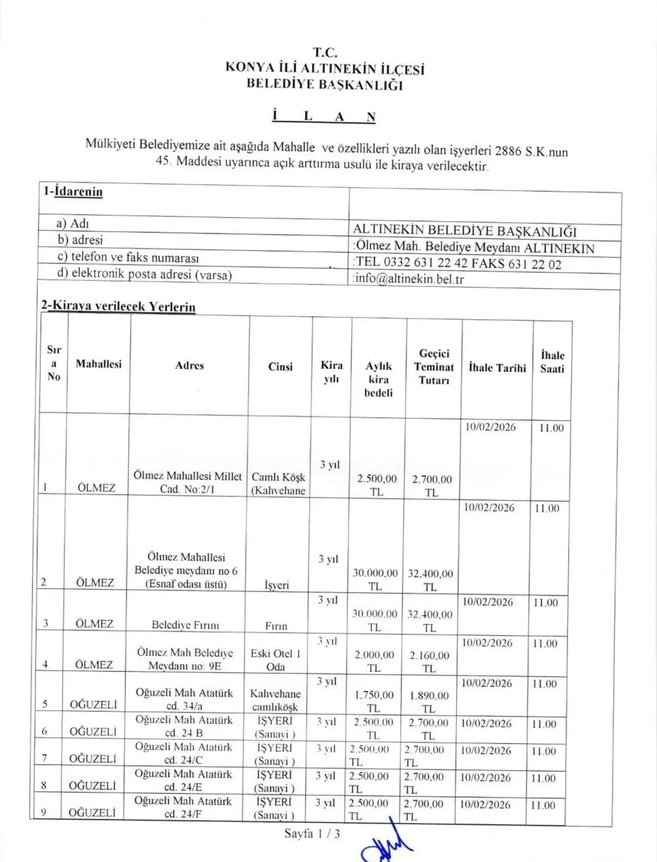 Mülkiyeti Altınekin Belediyesine ait 39 adet iş yeri, 10 Şubat 2026 Salı günü saat 11.00’de, Belediye Toplantı Salonu’nda