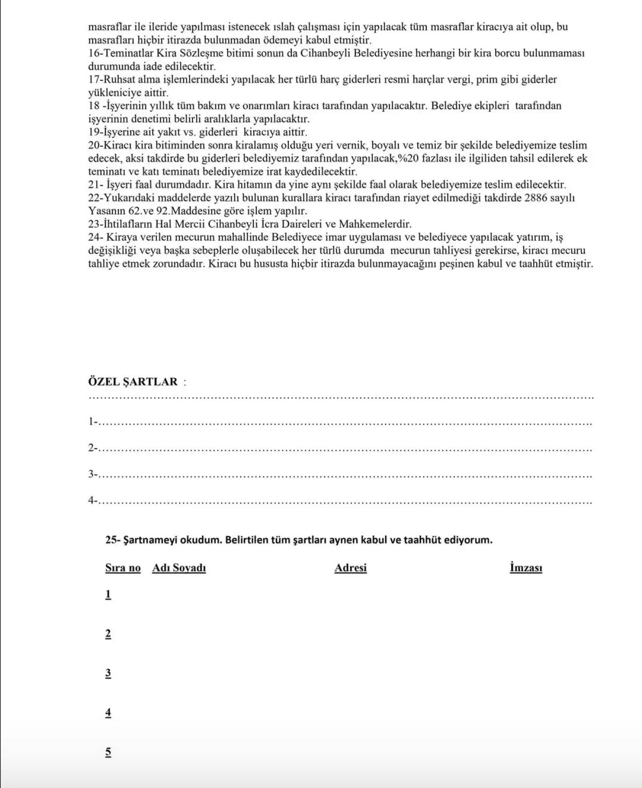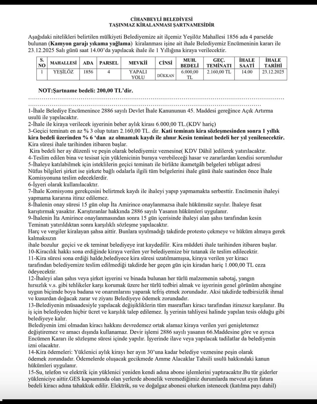 Cihanbeyli Belediyesi’ne ait Yeşilöz Mahallesi Kamyon Garajı içerisinde bulunan Yıkama ve Yağlama Tesisi, ihale yoluyla 1 (bir) yıllığına kiraya verilecek.