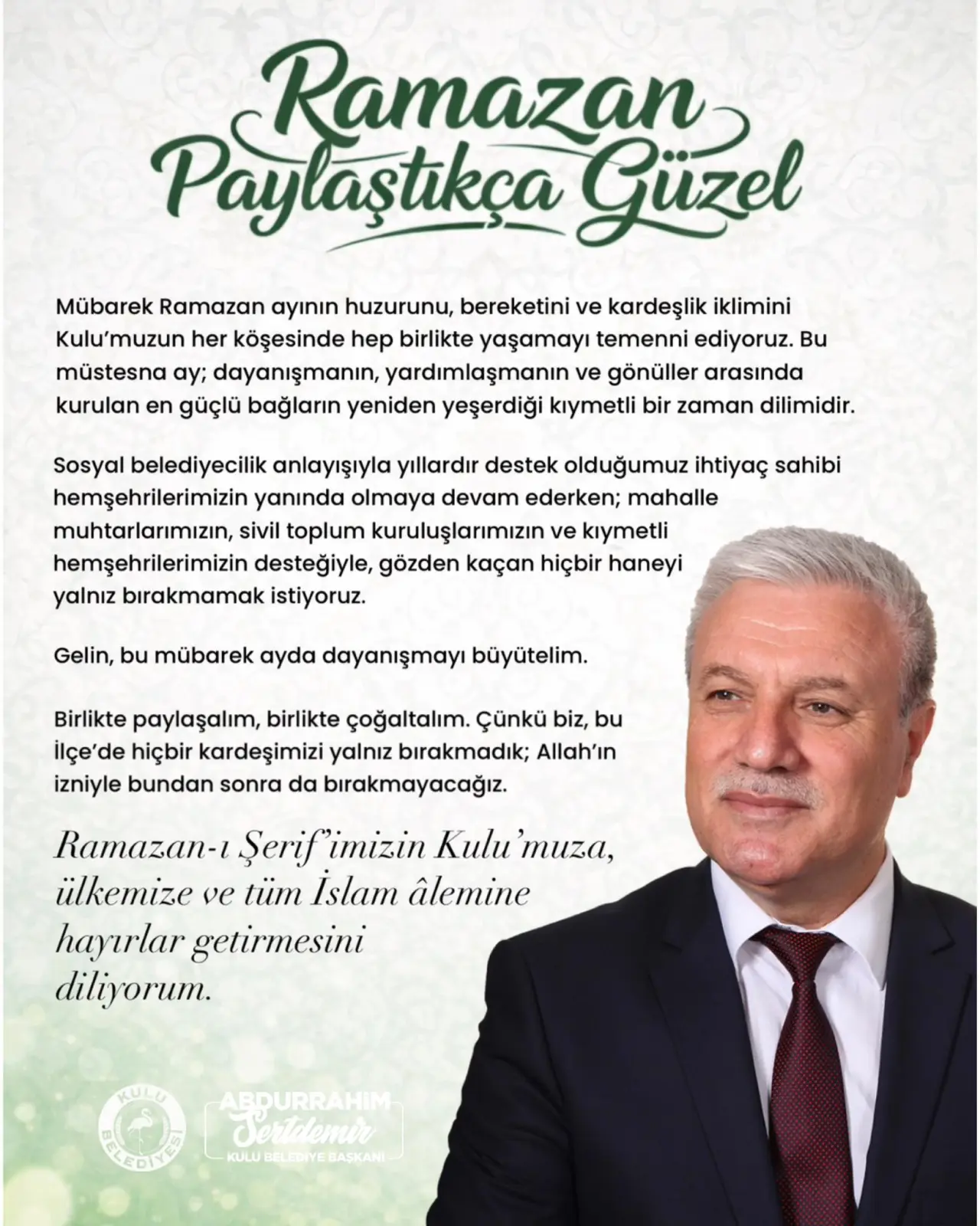 Başkan Sertdemir, Ramazan ayının dayanışma ve paylaşma ruhunu hatırlatarak, tüm hemşehrilerinin Ramazan-ı Şerif’ini tebrik etti.