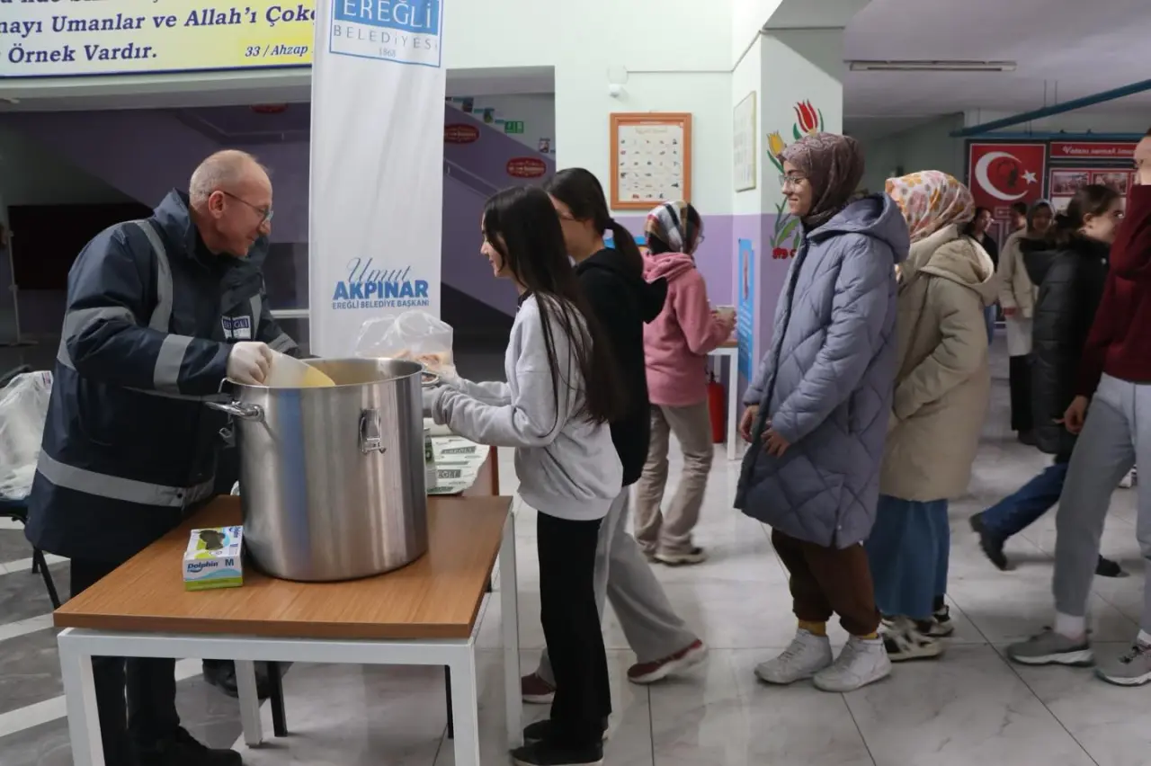 Ereğli Belediyesi, sosyal belediyecilik anlayışı kapsamında Gülbahçe Borsa İstanbul İmam Hatip Ortaokulu öğrencilerine sıcak çorba ikramında bulundu.