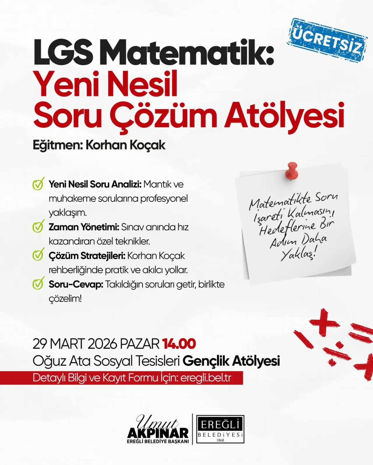 Belediye yetkilileri, atölyenin öğrencilerin sınav hazırlık süreçlerine katkı sağlayacağını ve yeni nesil matematik sorularını çözme becerilerini geliştireceğini belirtti. Detaylı bilgi ve kayıt için eregli.bel.tr/etkinlikler sayfası ziyaret edilebilecek.