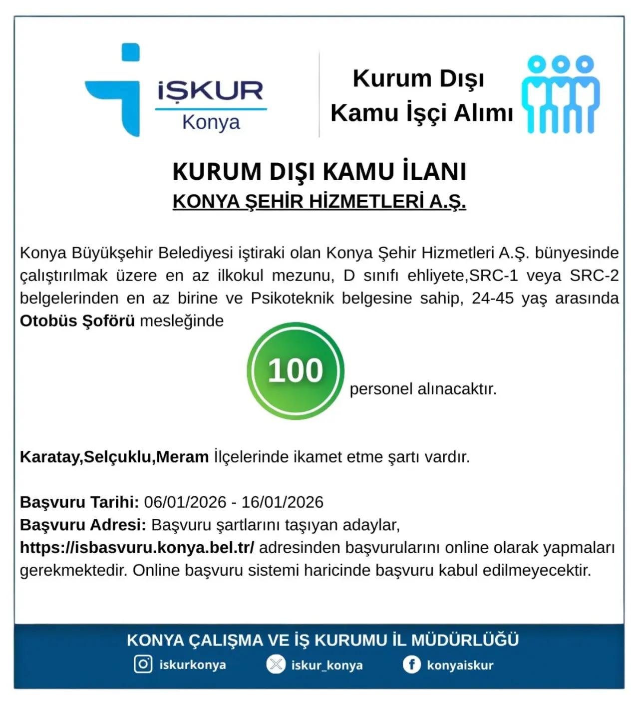 İlan süreci, Türkiye İş Kurumu (@turkiyeiskurumu) iş birliğiyle yürütülürken, Konya Büyükşehir Belediyesi istihdama katkı sağlamaya devam ediyor.