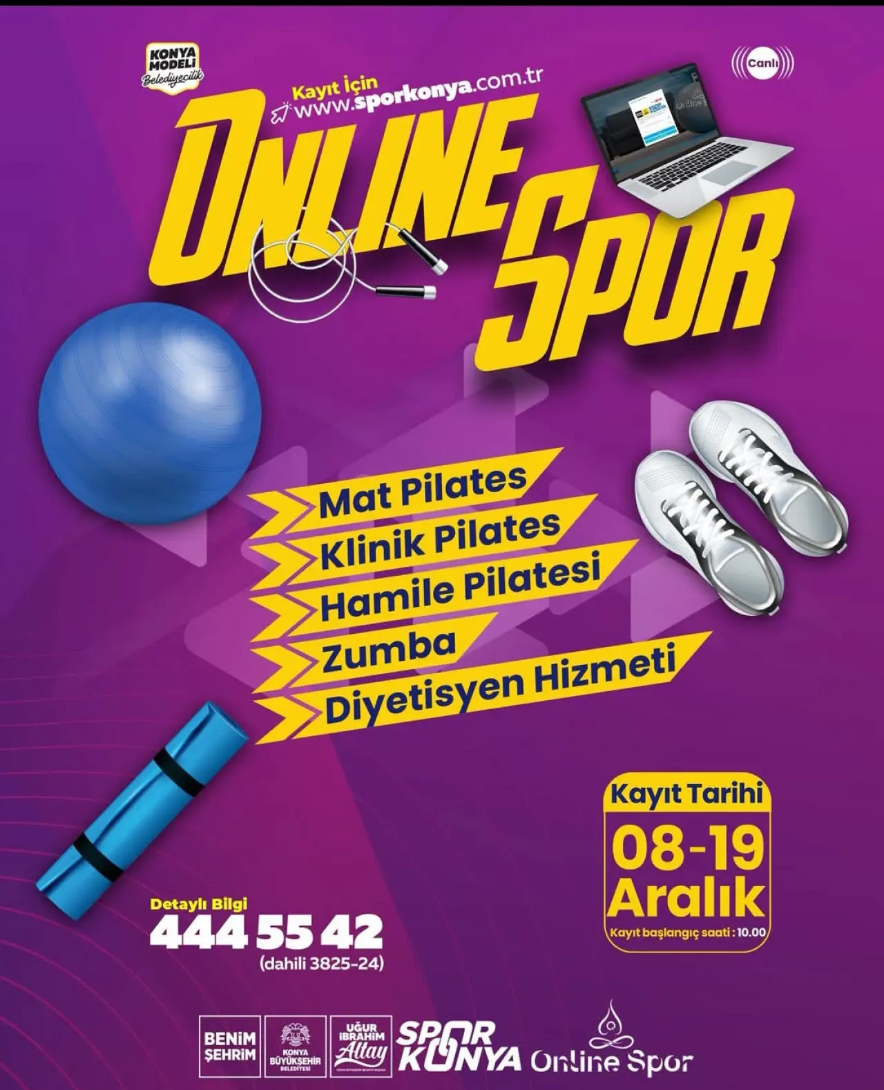 Konya Büyükşehir Belediyesi, vatandaşların sağlıklı yaşam alışkanlıklarını desteklemek amacıyla spor hizmetlerini online ortama taşıyor. Mat Pilates, Klinik Pilates, Hamile Pilatesi, Zumba ve Diyetisyen Hizmeti için online kayıtlar 8 Aralık’ta başlıyor.
