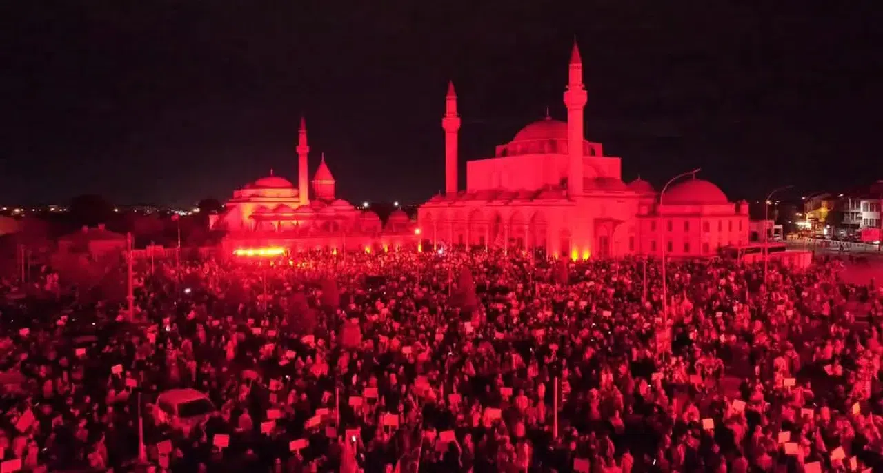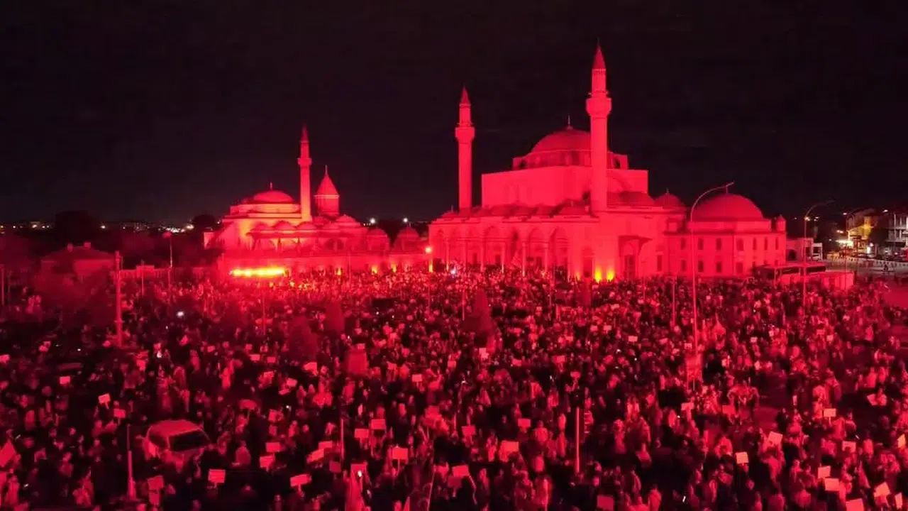 Etkinlik boyunca Mevlana Meydanı’ndaki tüm ışıklar kapatıldı, yalnızca kırmızı ışık yakılarak Gazze’de akan kan sembolize edildi. Kırmızı ışığın aydınlattığı meydanda derin bir sessizlik hâkim olurken, katılımcılar ellerini semaya kaldırarak Filistin halkı için adaletin ve barışın hâkim olması adına dualar etti.