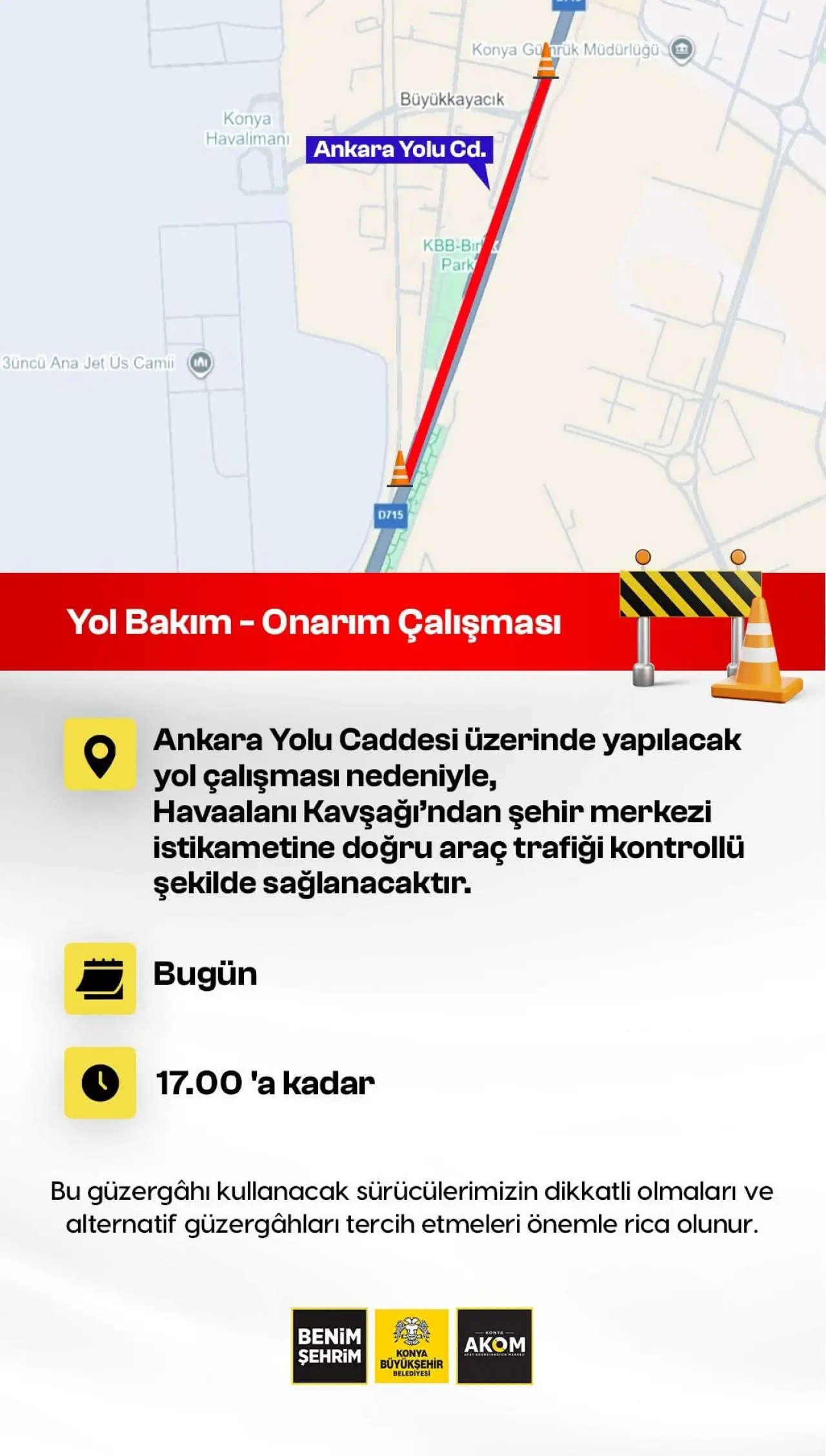 Konya Büyükşehir Belediyesi Afet Koordinasyon Merkezi (AKOM), Ankara Yolu Caddesi üzerinde yapılacak bakım-onarım çalışması nedeniyle trafikte geçici düzenlemeye gidildiğini duyurdu.