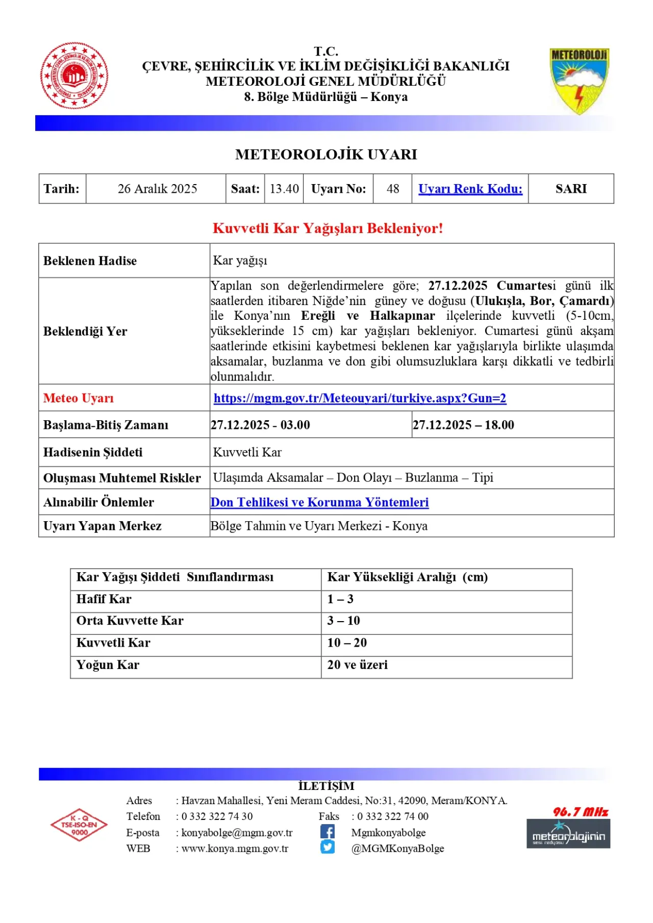 Konya İl Tarım ve Orman Müdürlüğü, bölgede beklenen kuvvetli kar yağışları nedeniyle vatandaşları uyardı. Yapılan meteorolojik değerlendirmelere göre, önümüzdeki günlerde etkili olması beklenen kar yağışıyla birlikte çeşitli olumsuzlukların yaşanabileceği bildirildi.