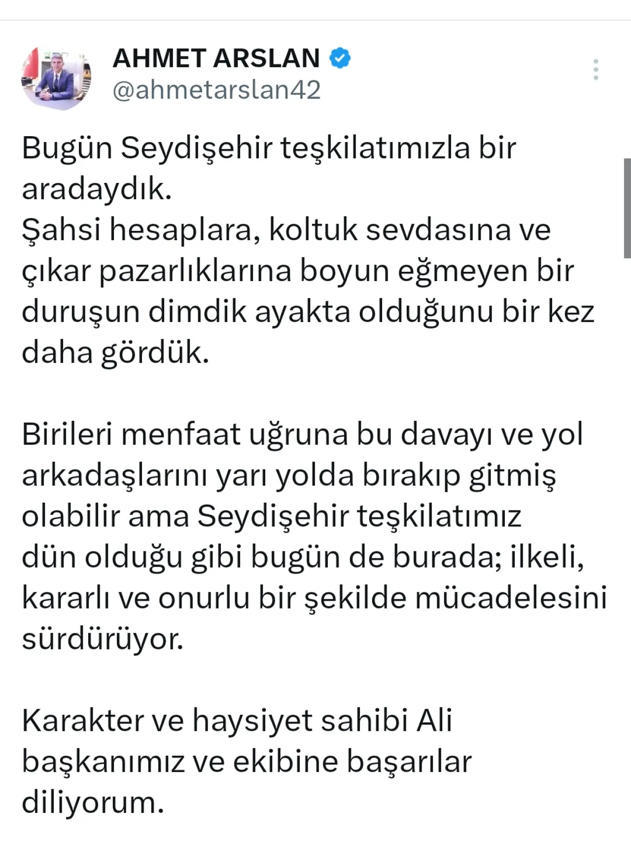 Bazı isimlerin menfaat uğruna davayı ve yol arkadaşlarını yarı yolda bıraktığını ima eden Arslan, buna rağmen Seydişehir teşkilatının ilkelerinden taviz vermeden yoluna devam ettiğini söyledi. Açıklamasında birlik ve sadakat vurgusu öne çıktı.